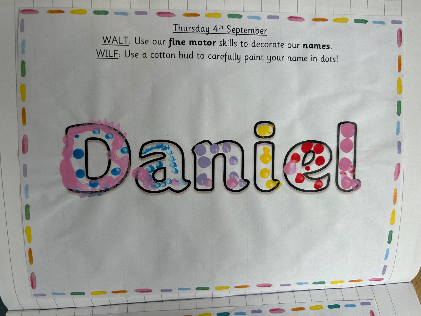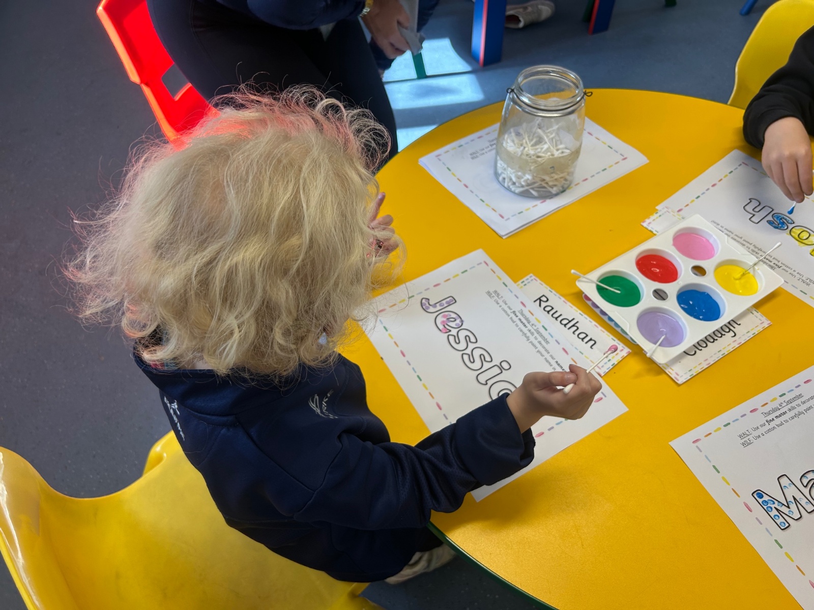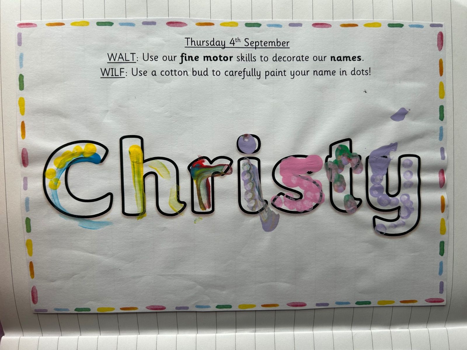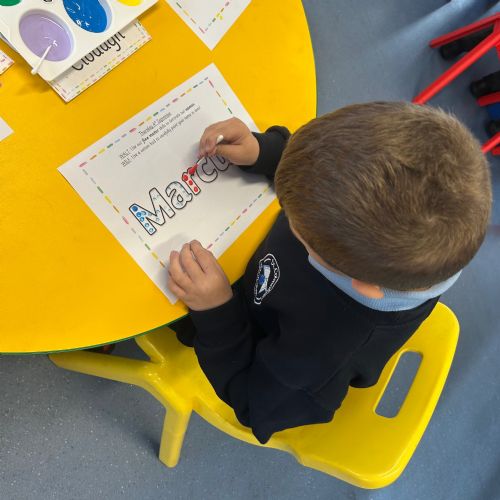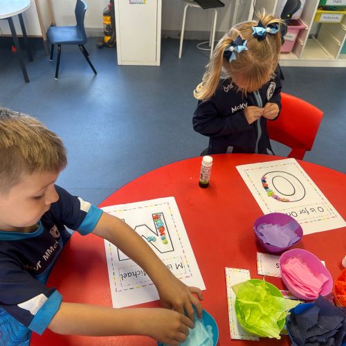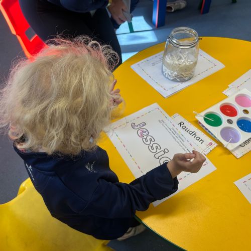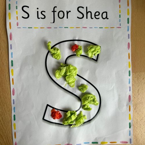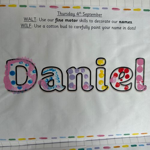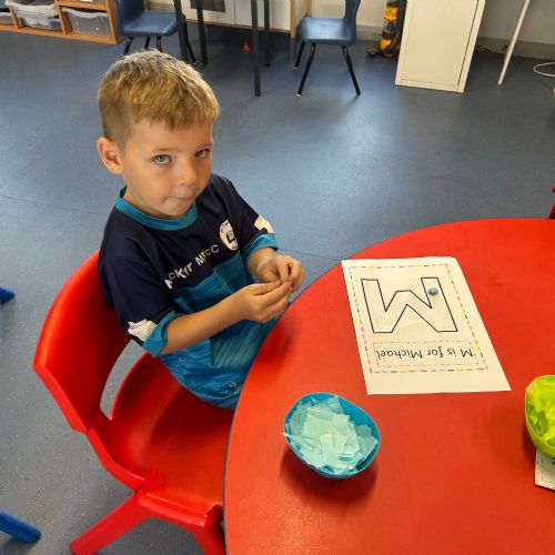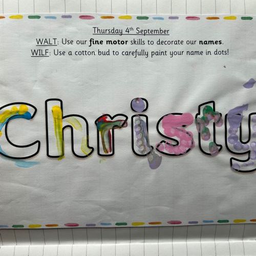 Today we explored the sounds that make us our name and the sound our names all begin with. We used our fine motor skills to create tissue paper initials, and used cotton buds to paint the letters in our names!