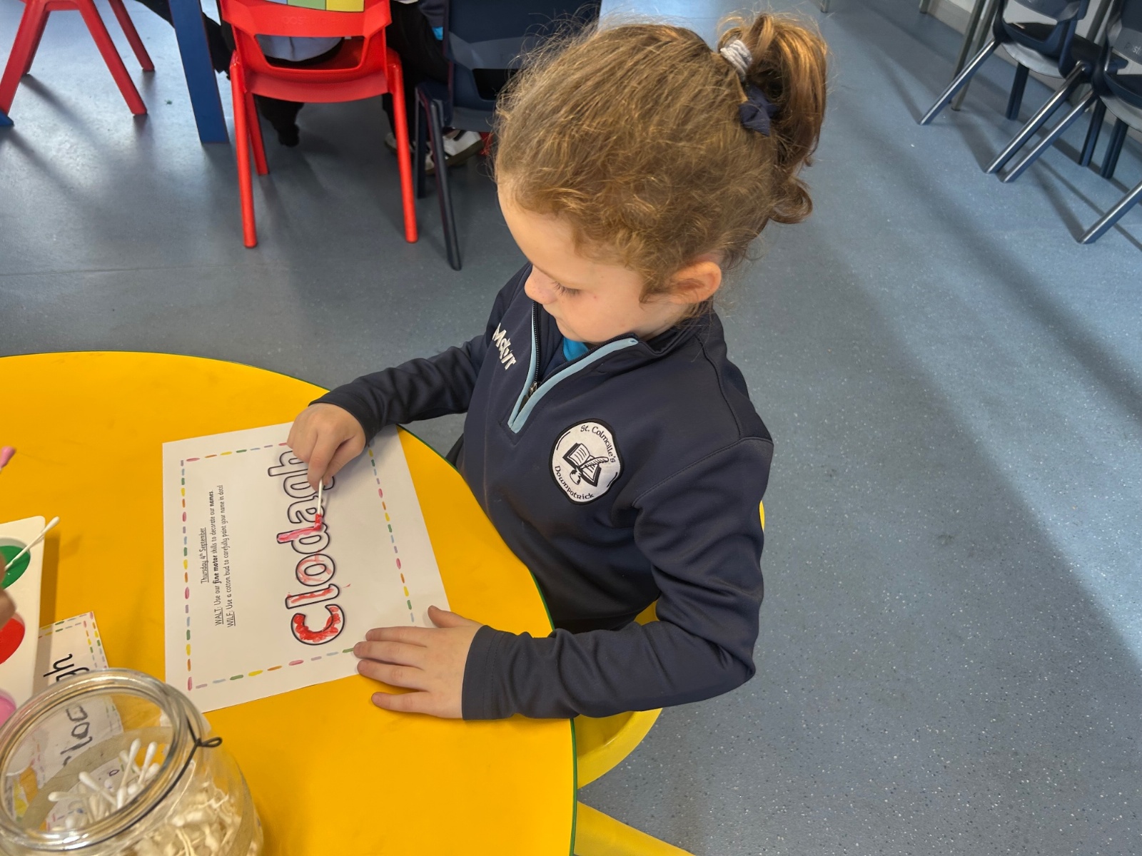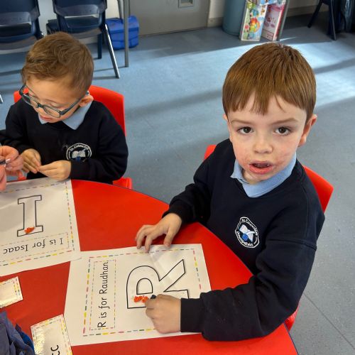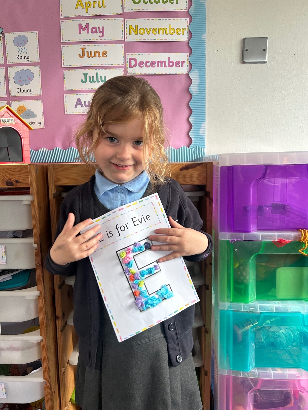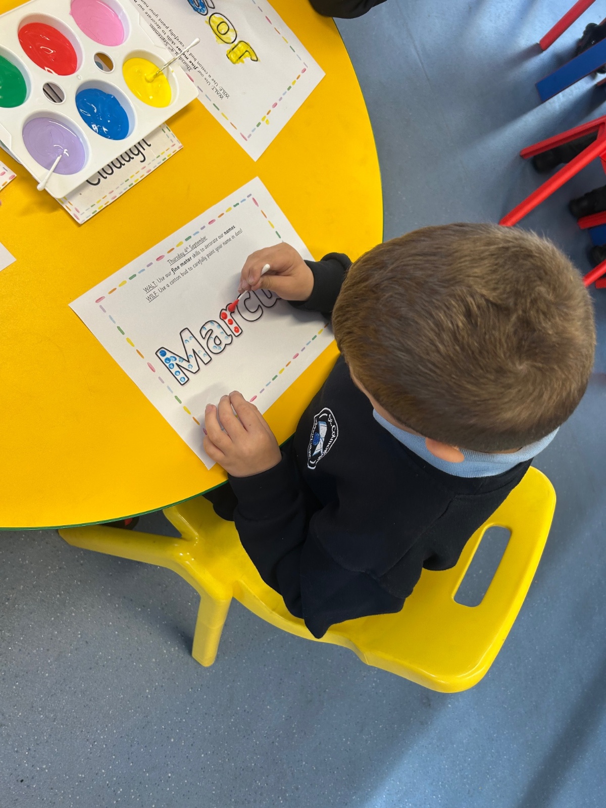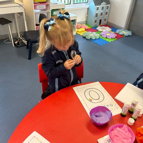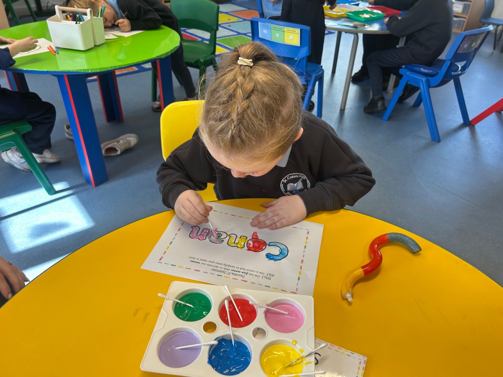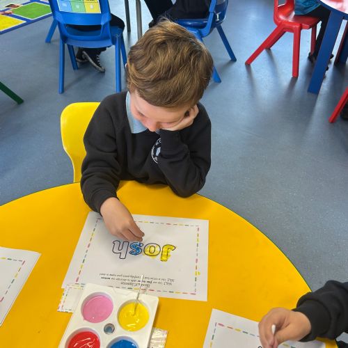 Today we explored the sounds that make us our name and the sound our names all begin with. We used our fine motor skills to create tissue paper initials, and used cotton buds to paint the letters in our names!
