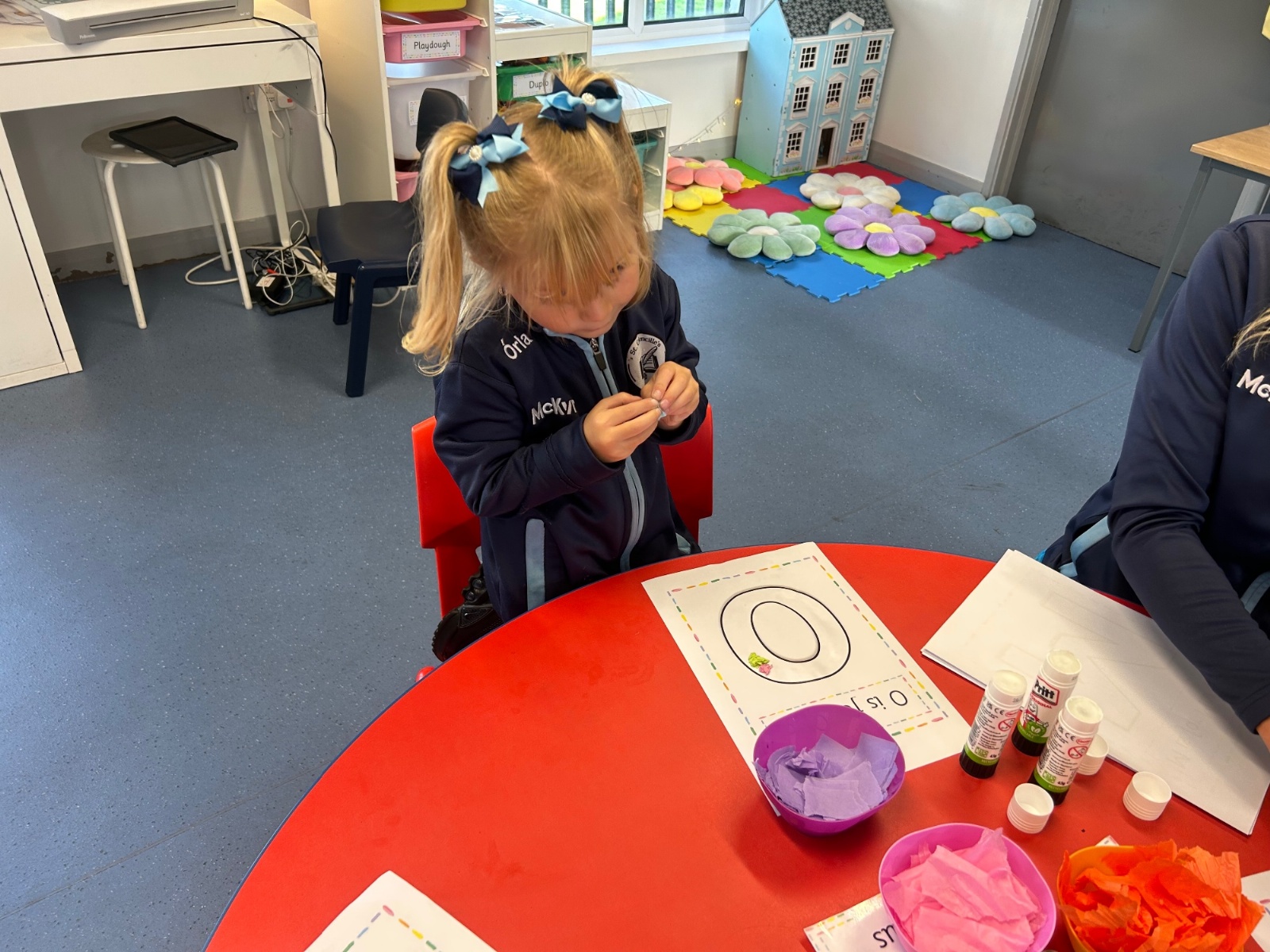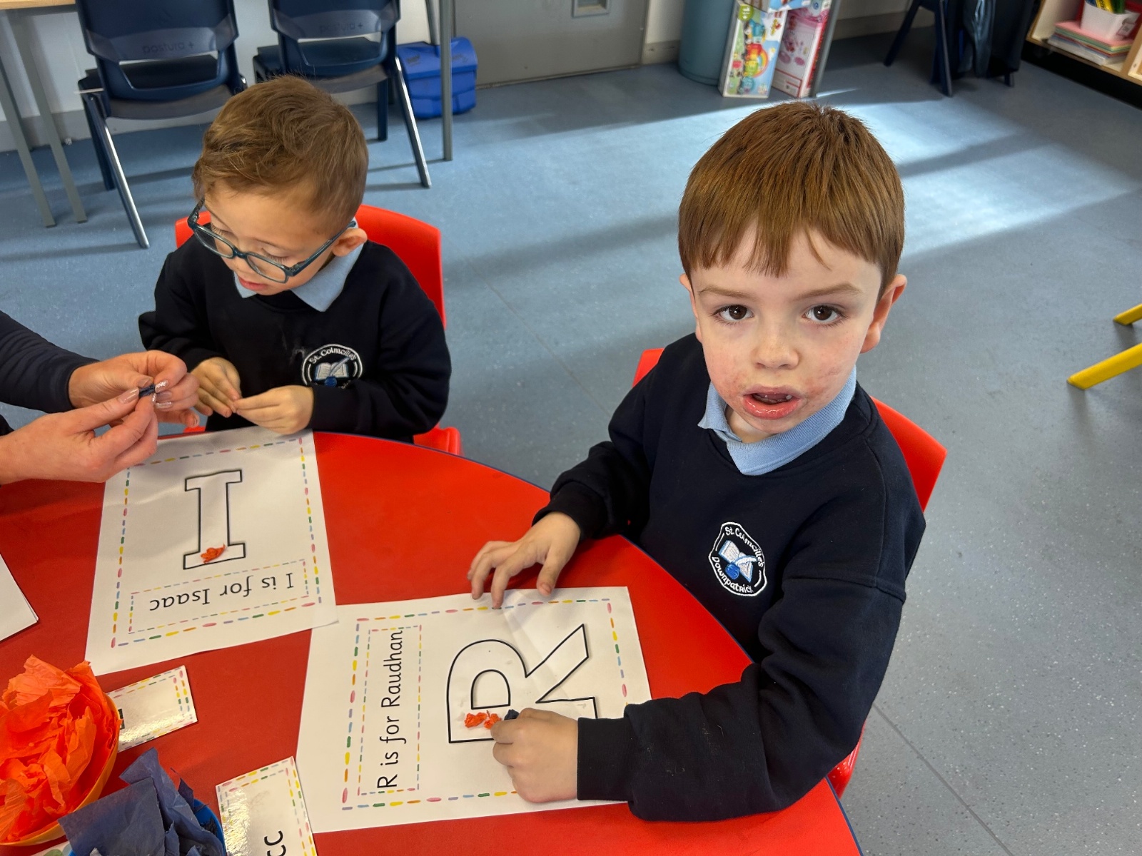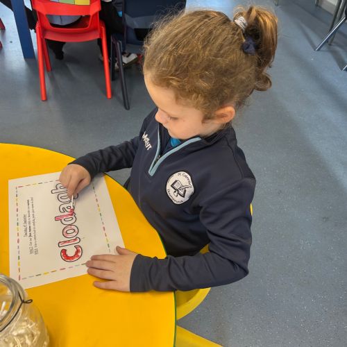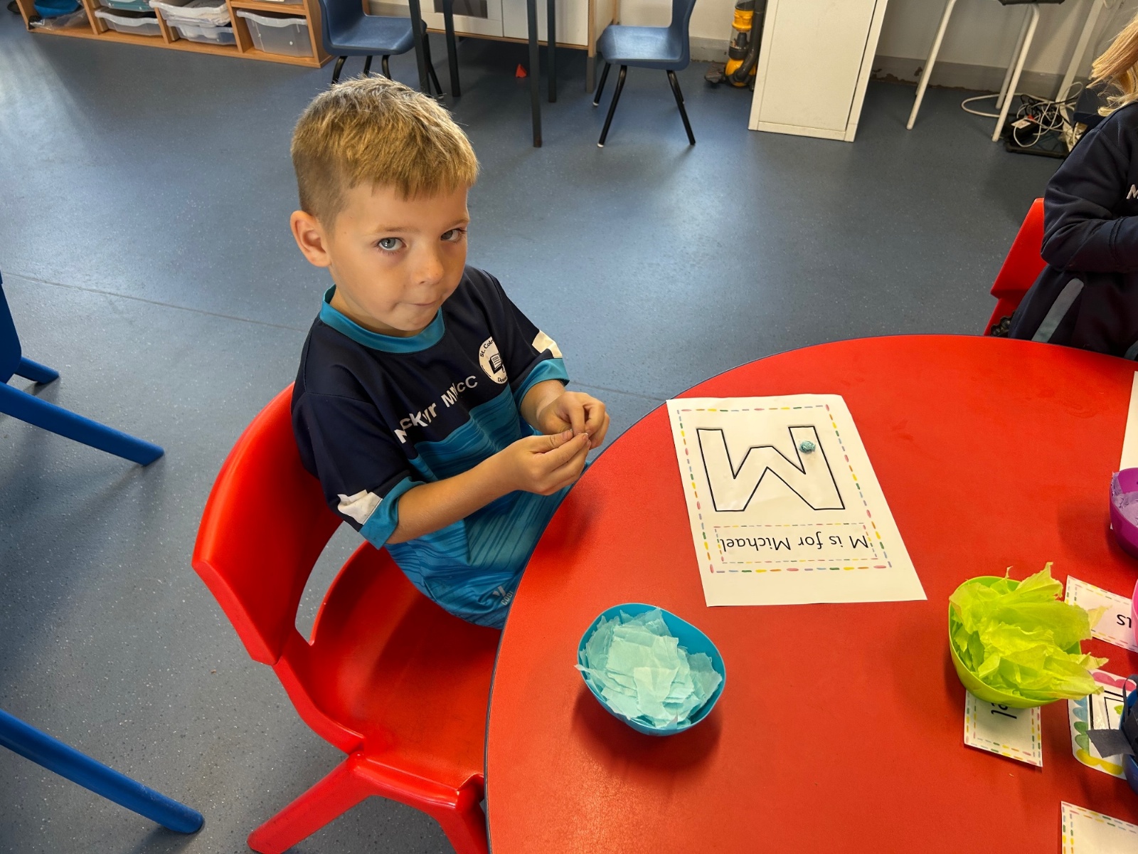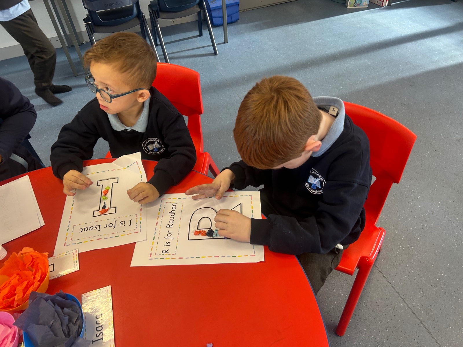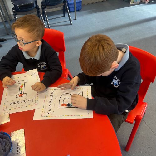 Today we explored the sounds that make us our name and the sound our names all begin with. We used our fine motor skills to create tissue paper initials, and used cotton buds to paint the letters in our names!