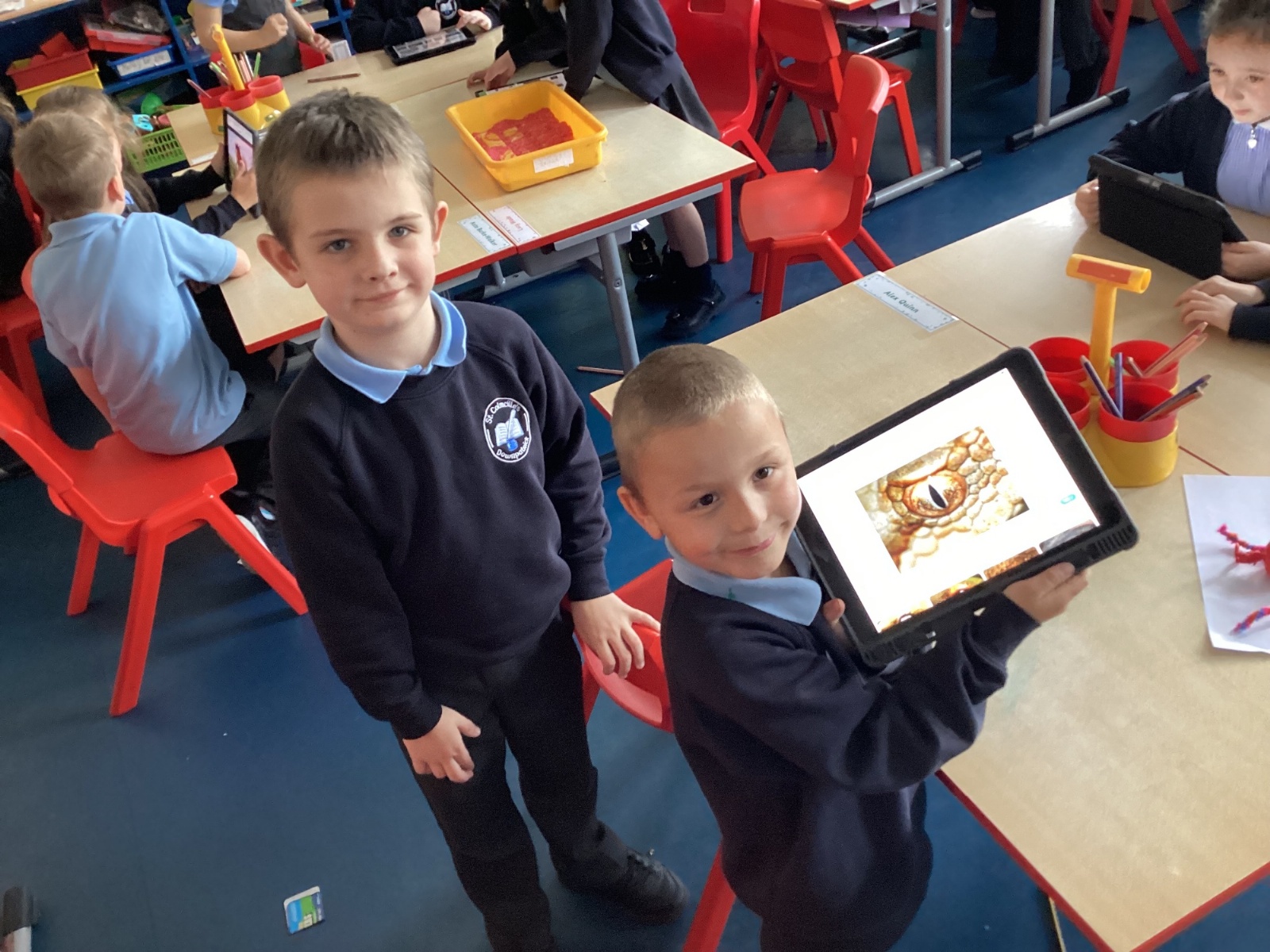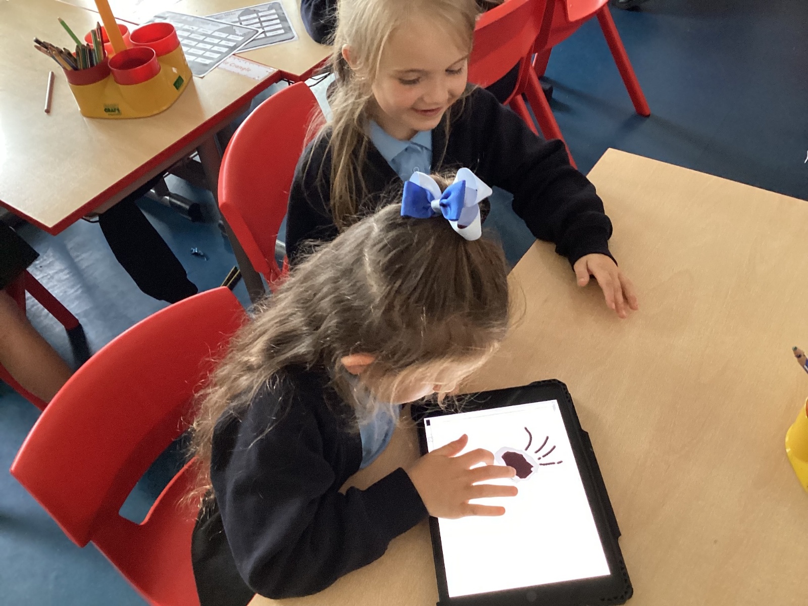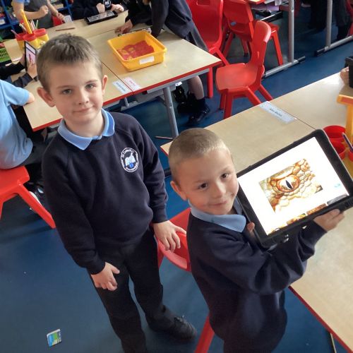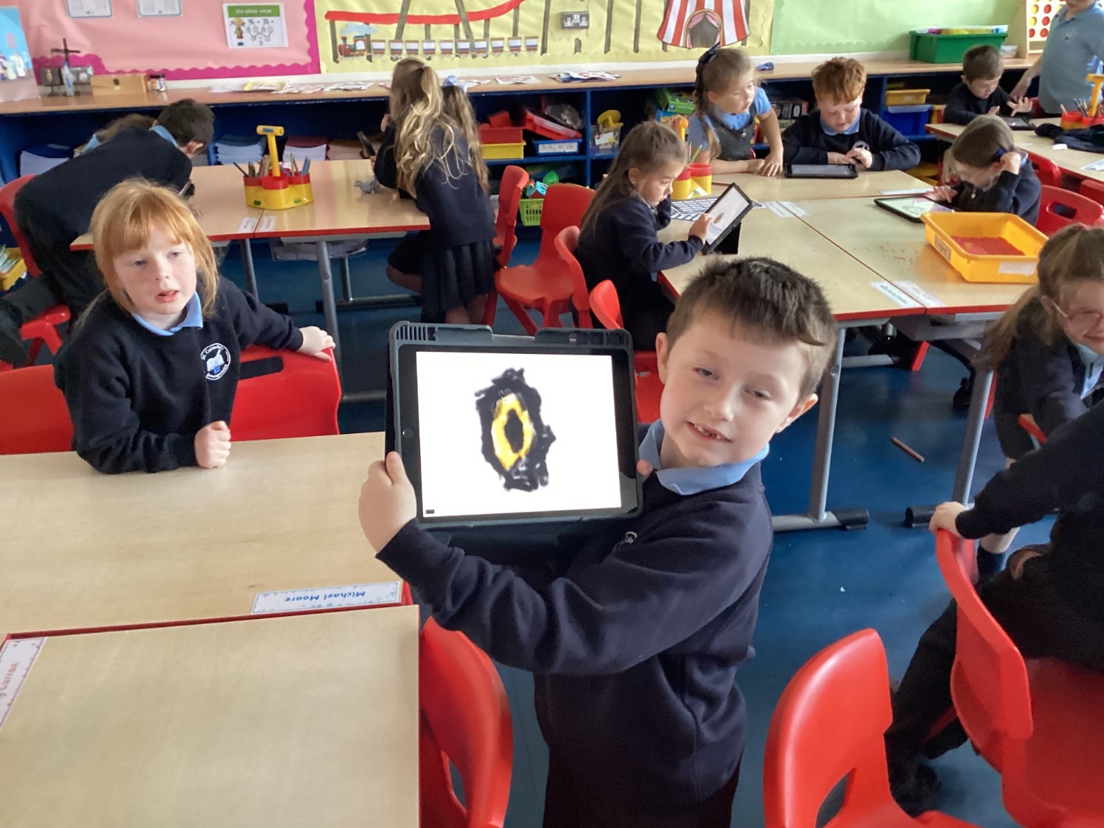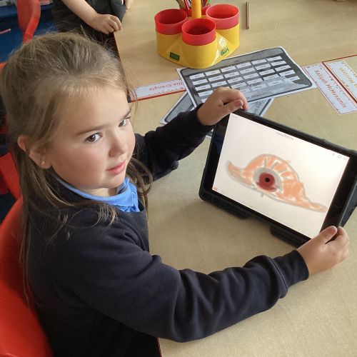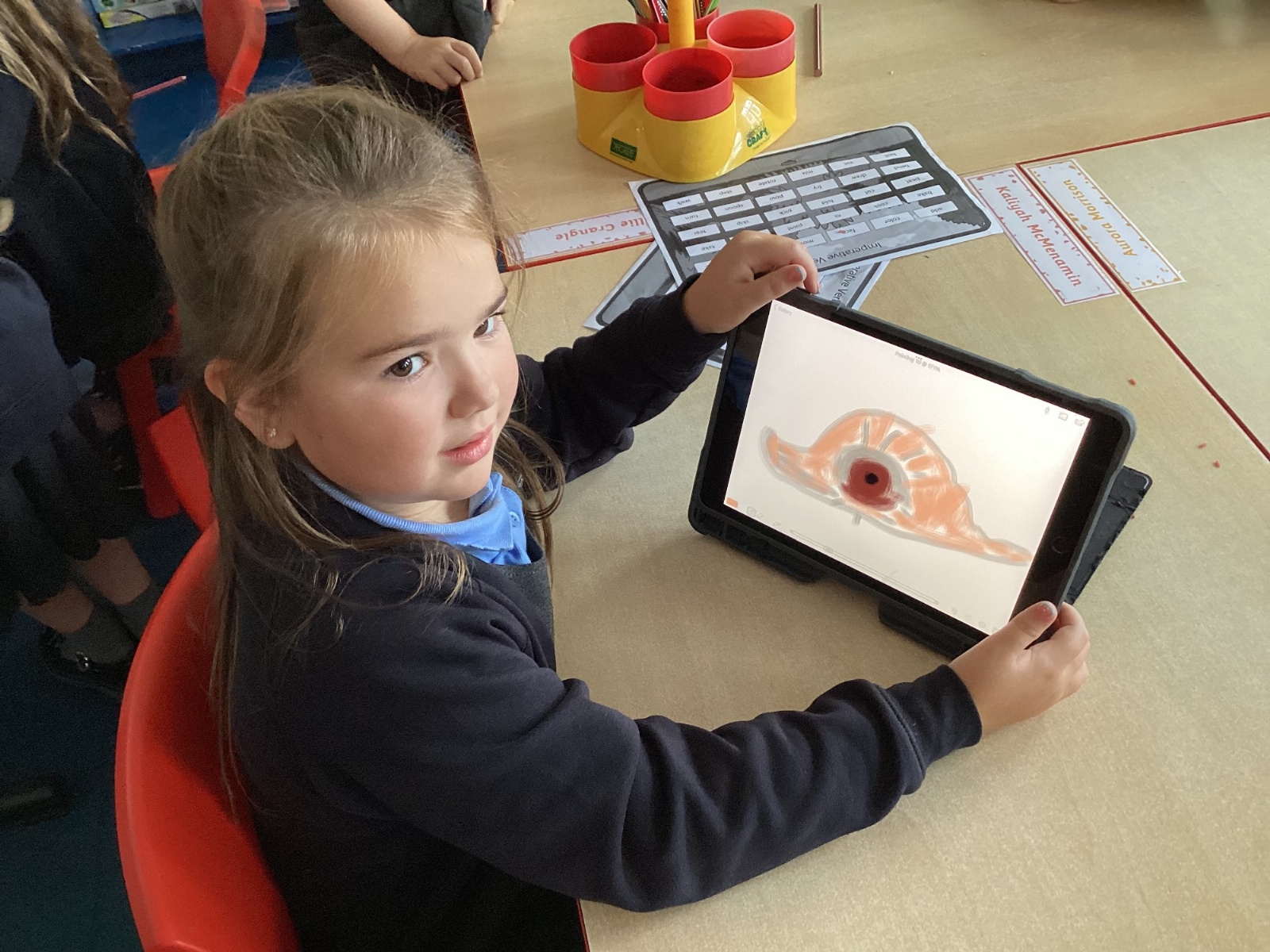 Today, the children used iPads to investigate the function of various animal eyes and how they differ from human eyes. Drawing on their research, they then used the Brushes Redux app to create digital artwork of their chosen animal’s eye, incorporating the unique features they had discovered.