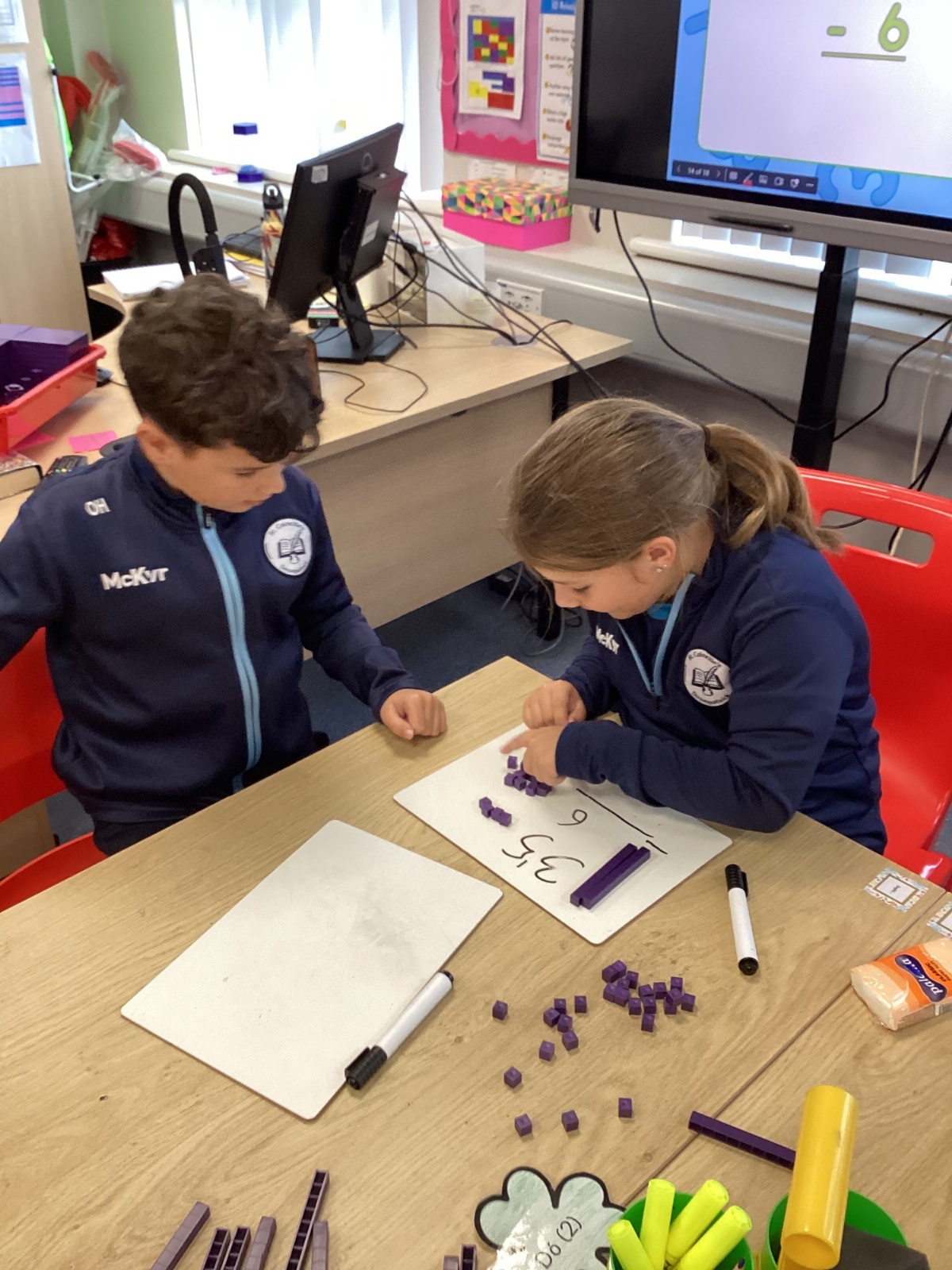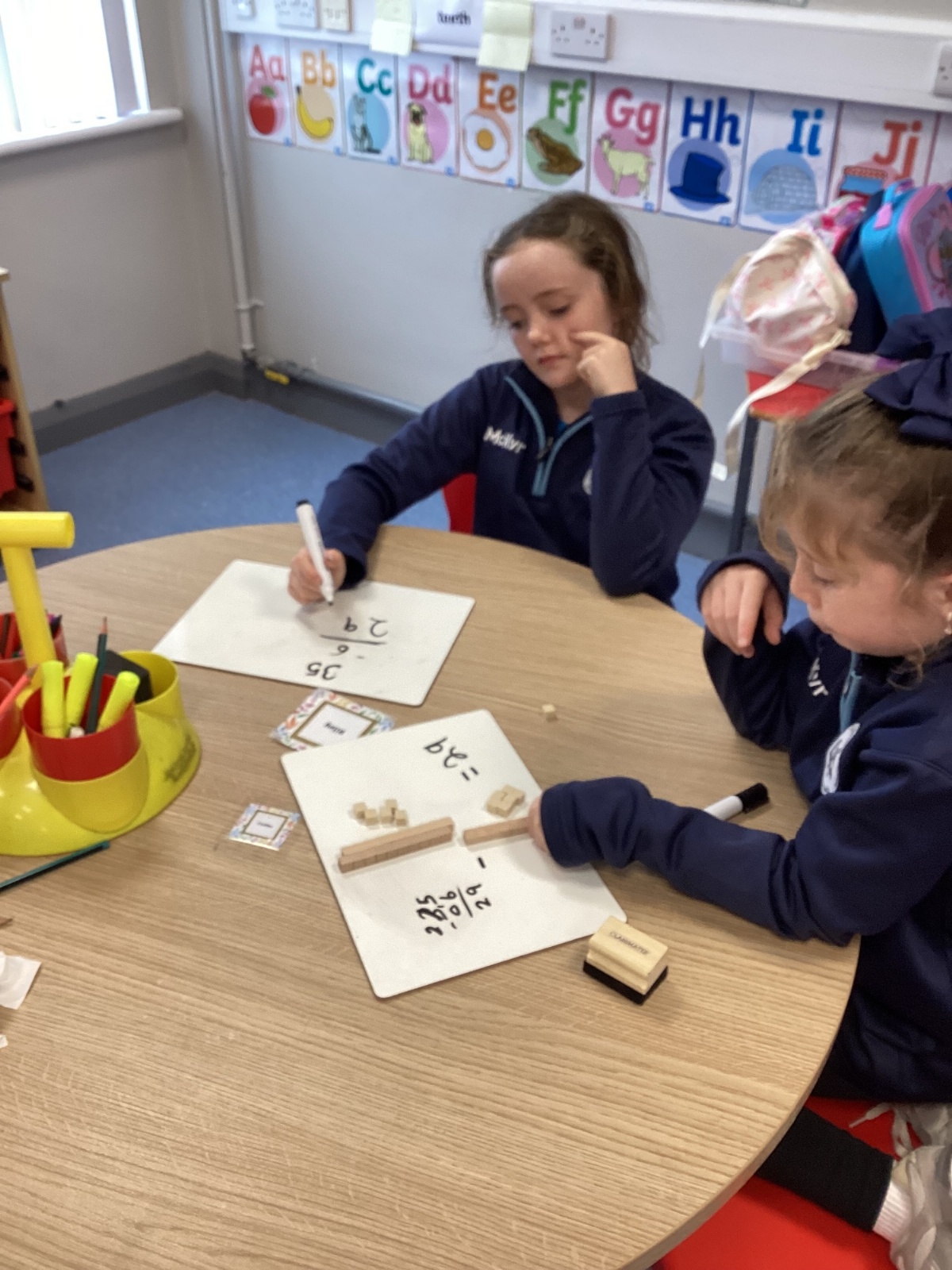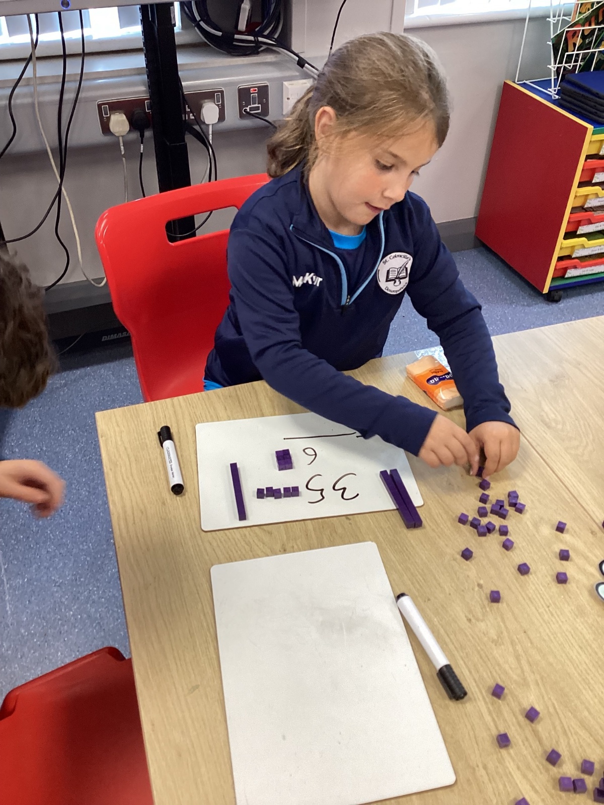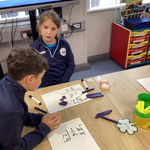 Pupils used base 10 (tens and units) to practically explore how to subtract with regrouping. They were able to borrow tens and change these into ones to subtract. They recorded their calculations using the column method.