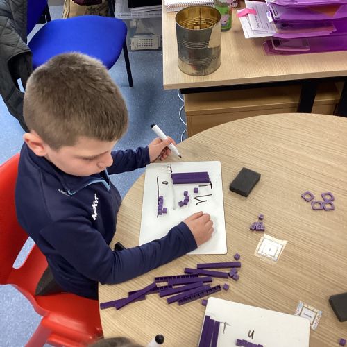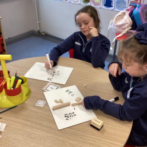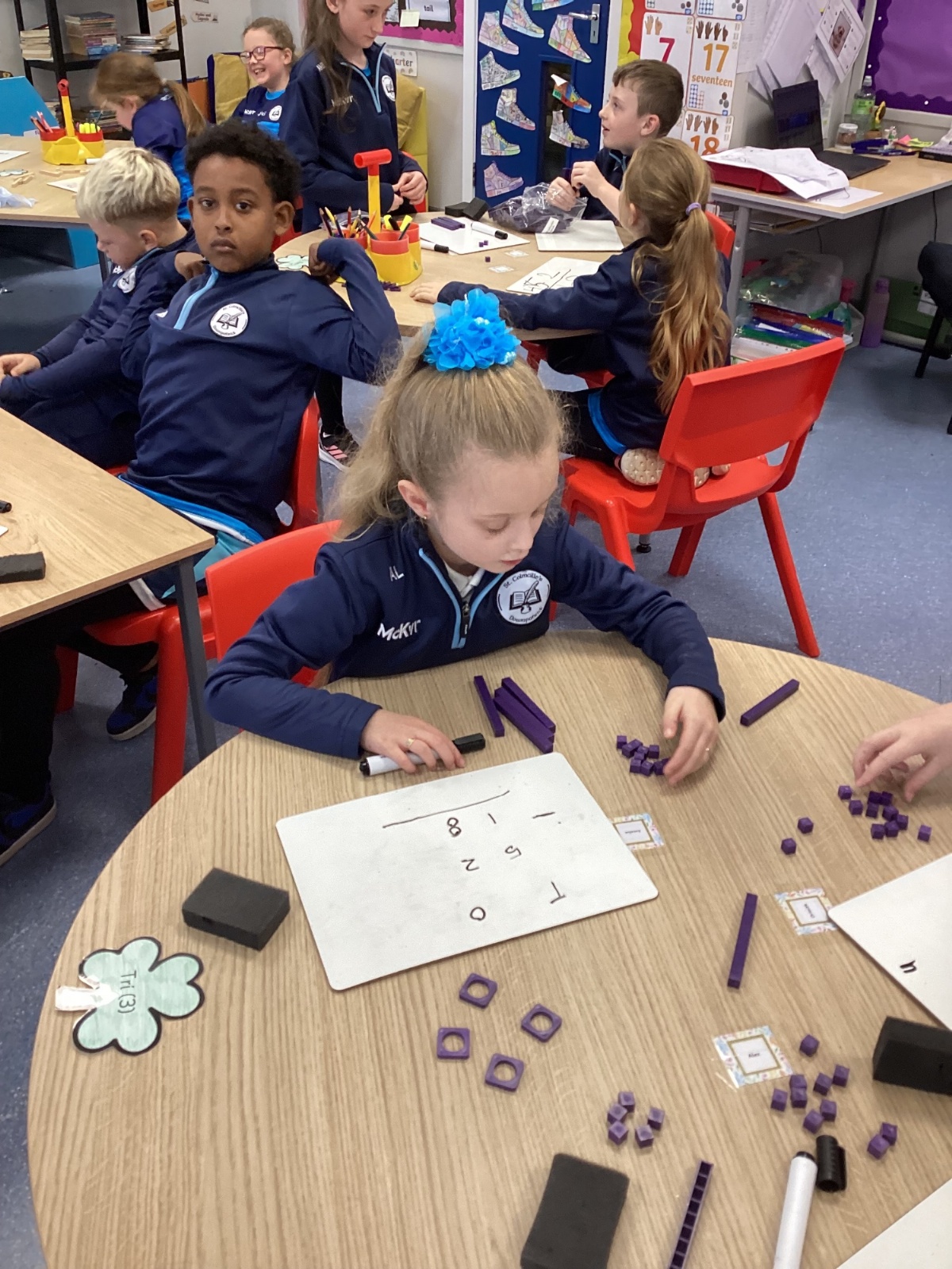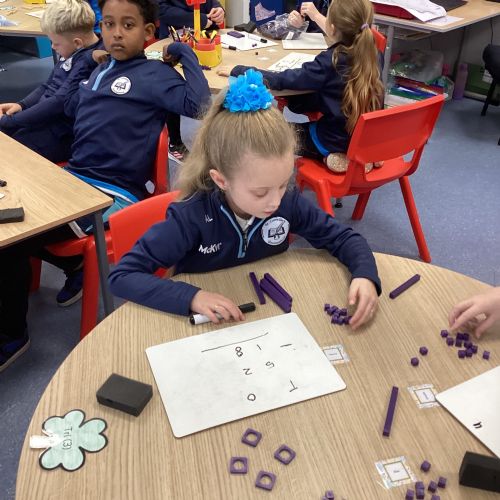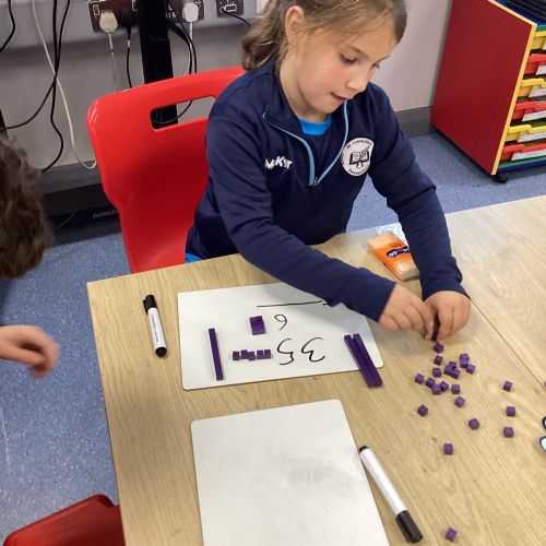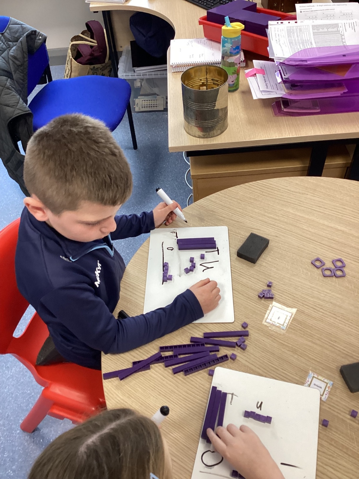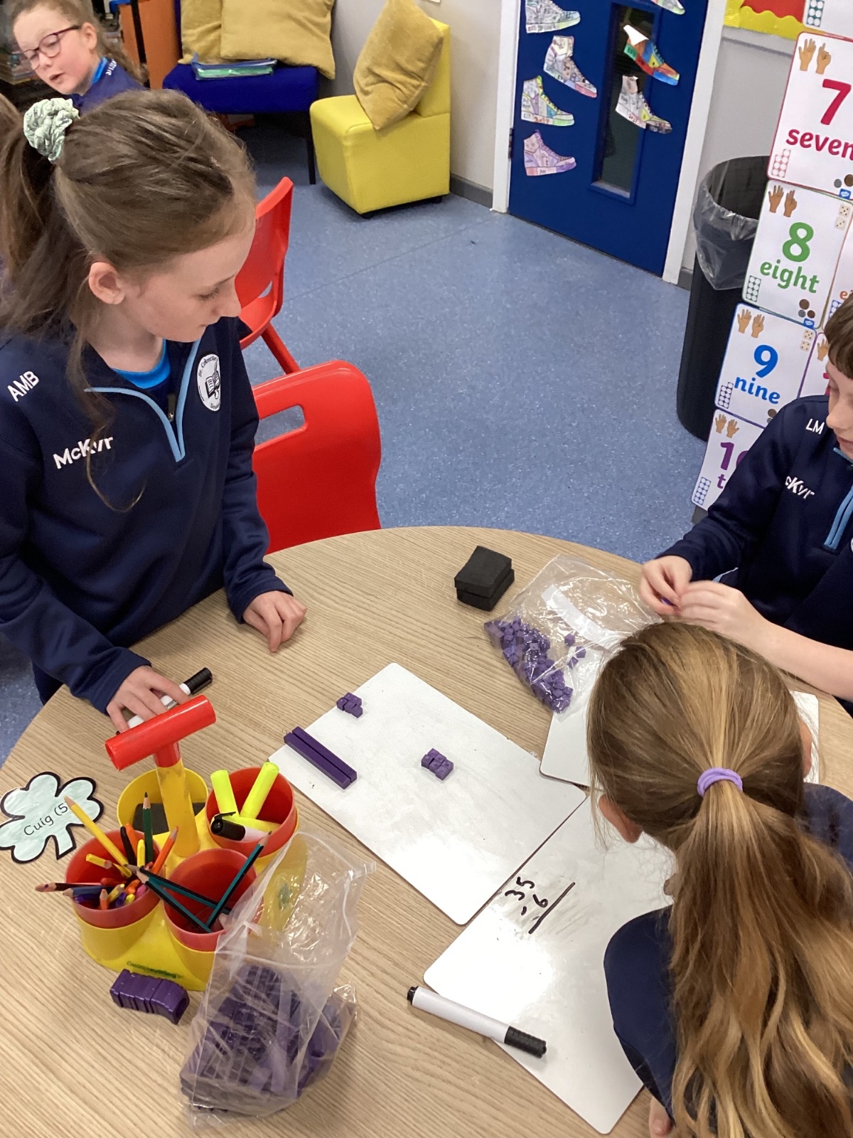 Pupils used base 10 (tens and units) to practically explore how to subtract with regrouping. They were able to borrow tens and change these into ones to subtract. They recorded their calculations using the column method.