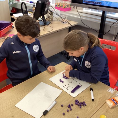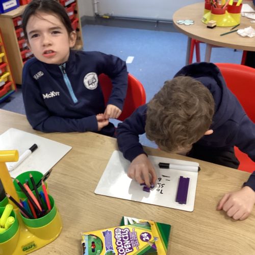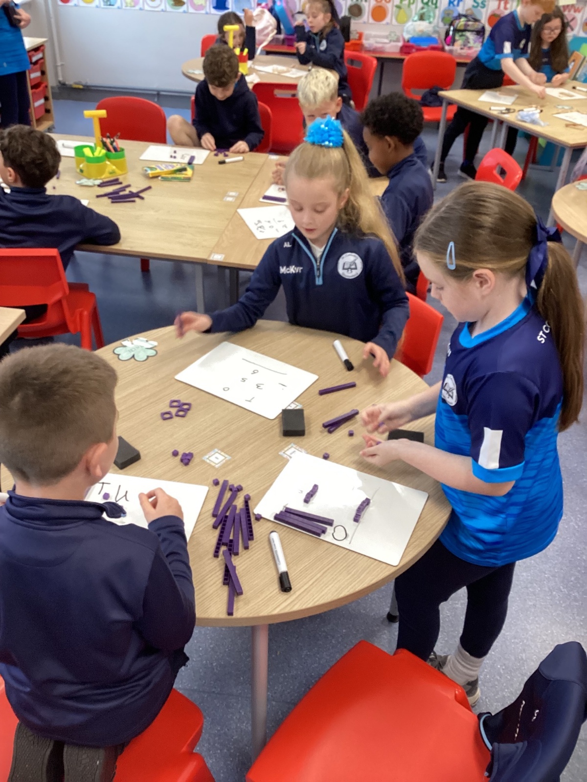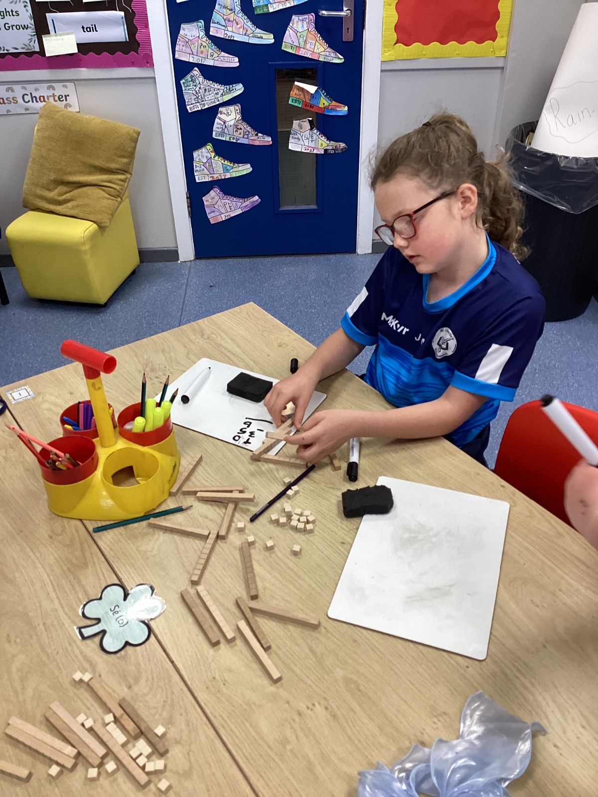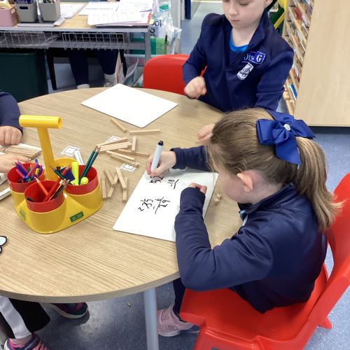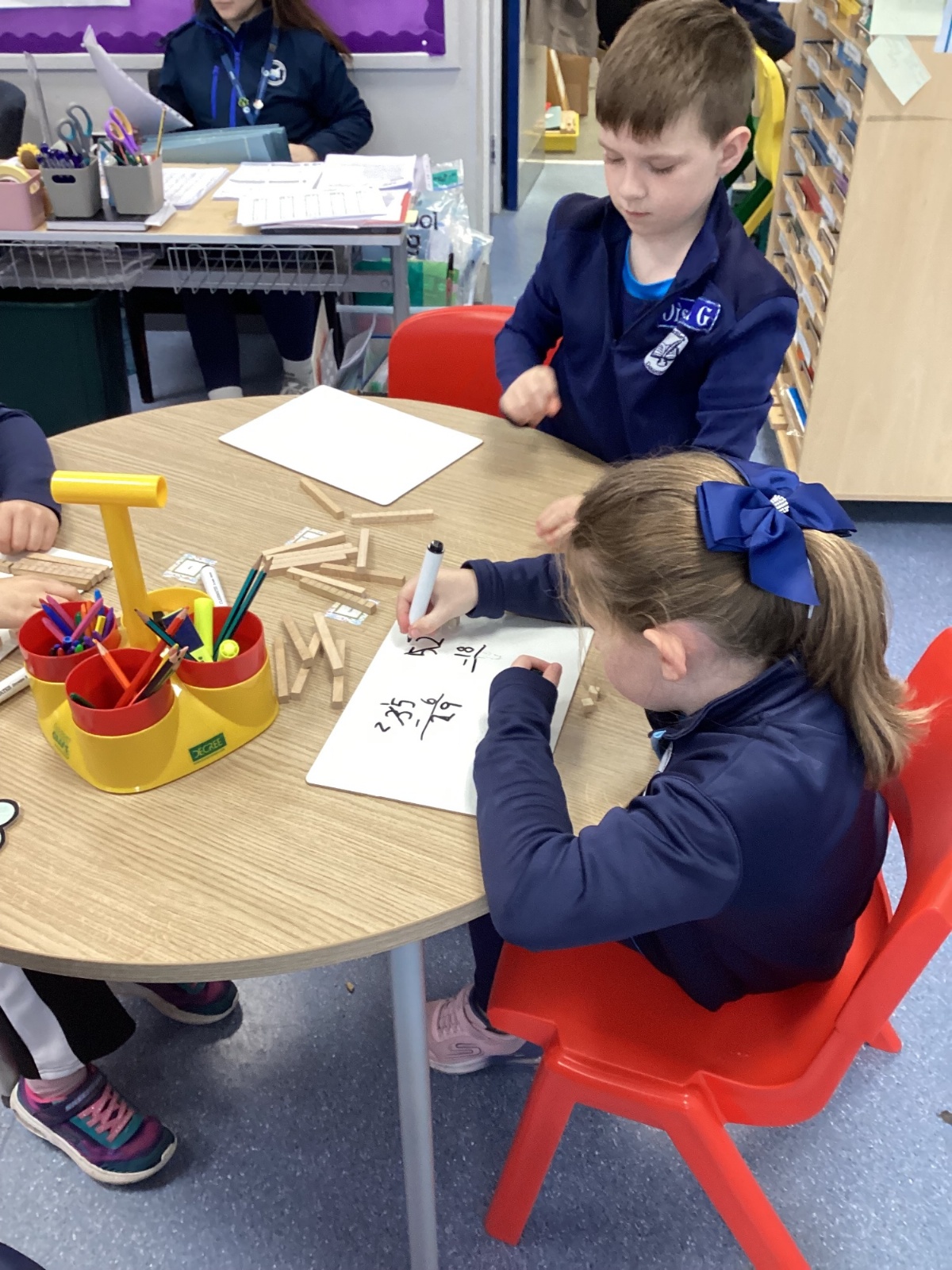 Pupils used base 10 (tens and units) to practically explore how to subtract with regrouping. They were able to borrow tens and change these into ones to subtract. They recorded their calculations using the column method.