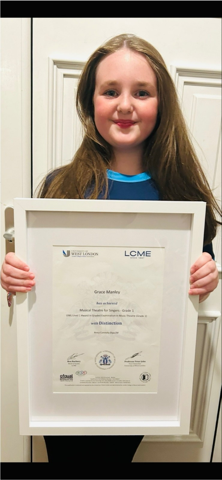 Congratulations to Grace Manley who was recently awarded a distinction in her Grade 1 singing. A fantastic achievement! Well done Grace!