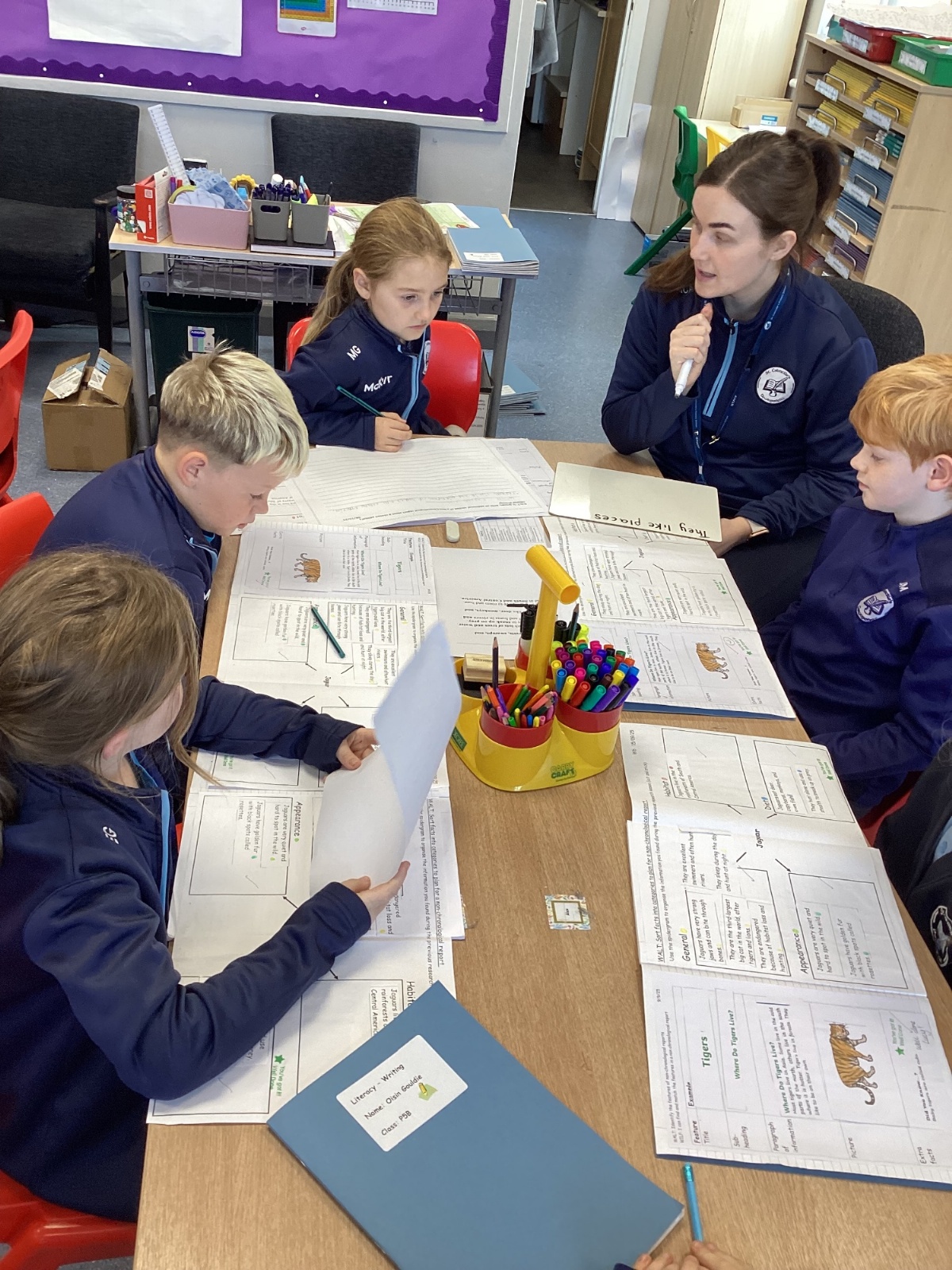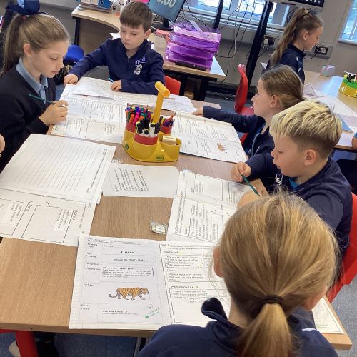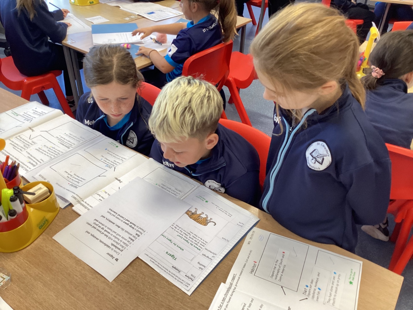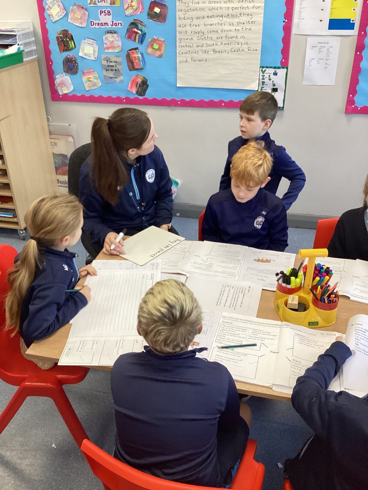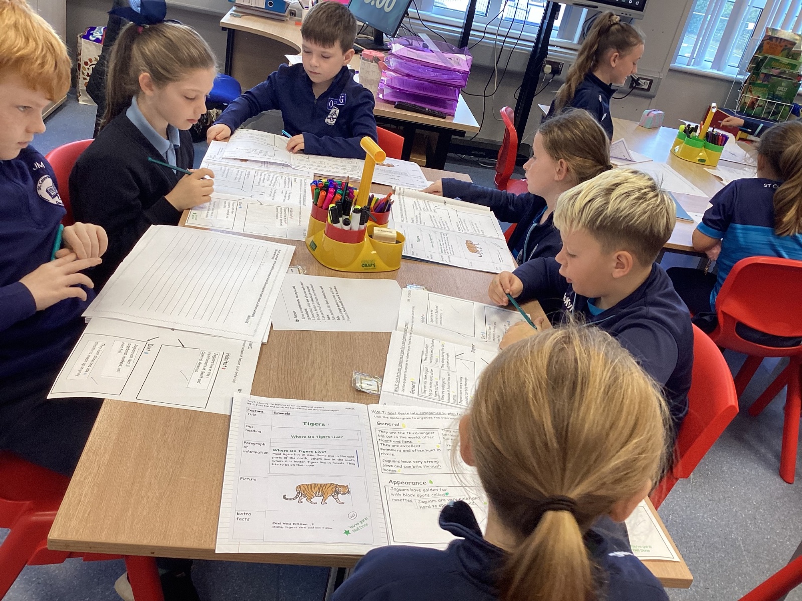 Pupils worked collaboratively in small groups to craft a paragraph about the habitat of a rainforest animal. Using research they had previously gathered on iPads and from information books, children discussed key facts, shared ideas, and supported one another in structuring their writing. The guided write encouraged teamwork, critical thinking, and creativity, as each group brought their chosen animal’s environment to life through rich vocabulary and detailed descriptions.