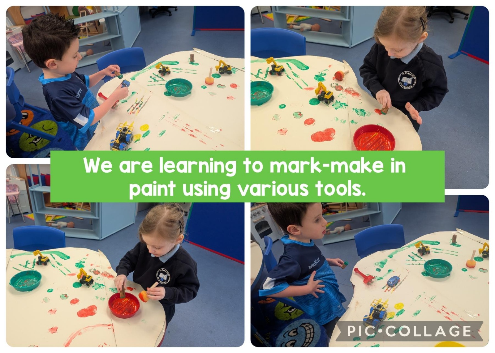 We are learning to mark-make in paint using various tools such as sponges, toy cars and paint brushes.