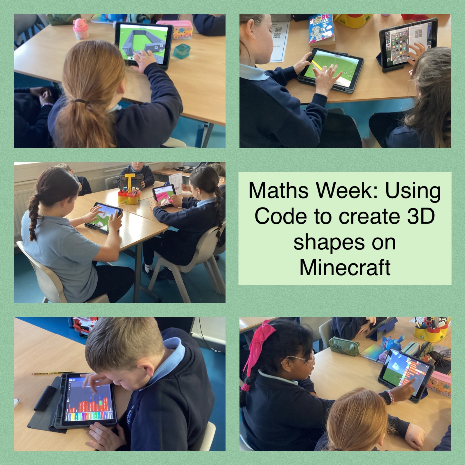 As part of Maths Week Ireland, we used coding on Minecraft to code a variety of 3D shapes. This also helped us celebrate EU Coding this week which took place this week also.