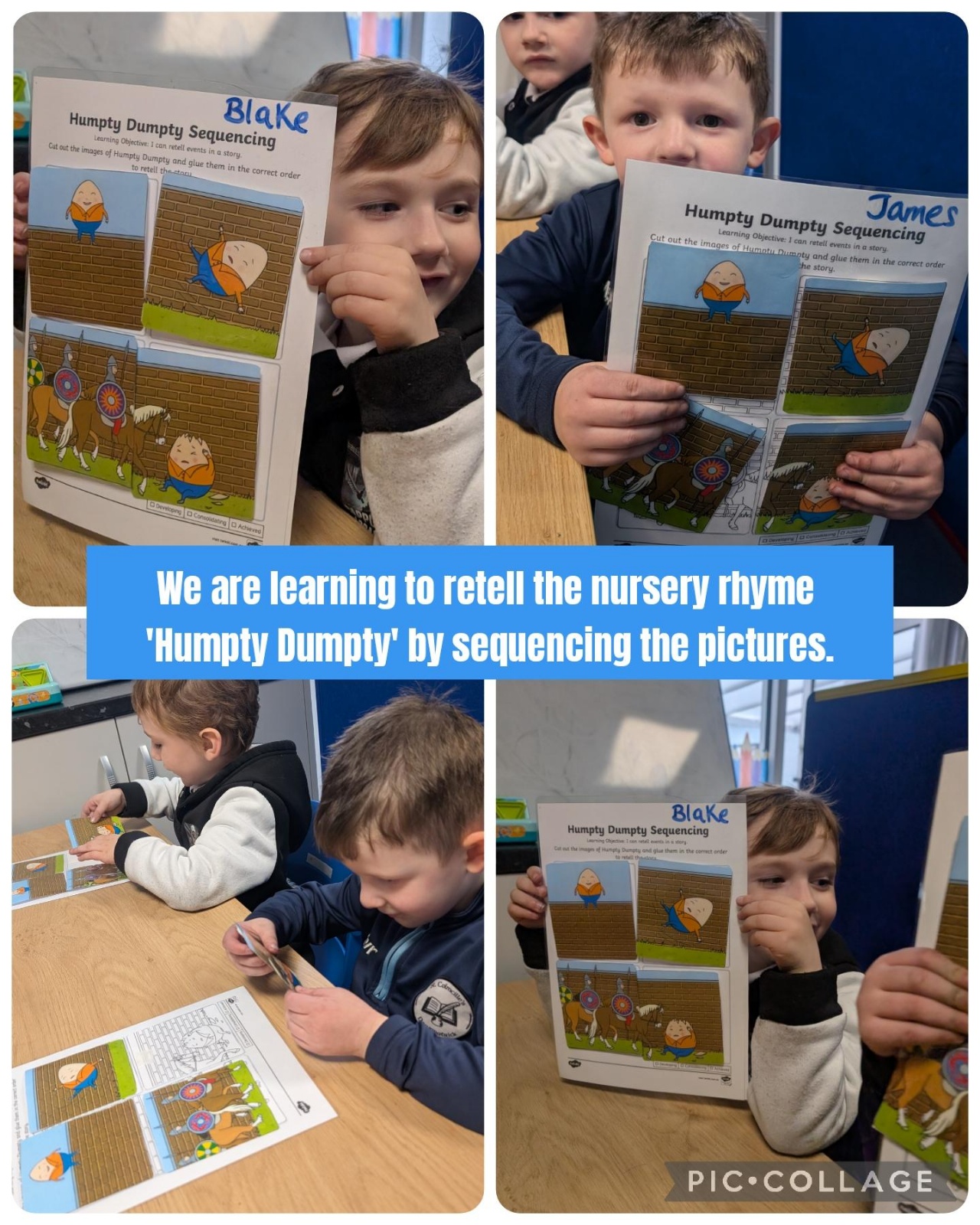 We were learning to retell the Nursery Rhyme 'Humpty Dumpty' by sequencing the pictures.