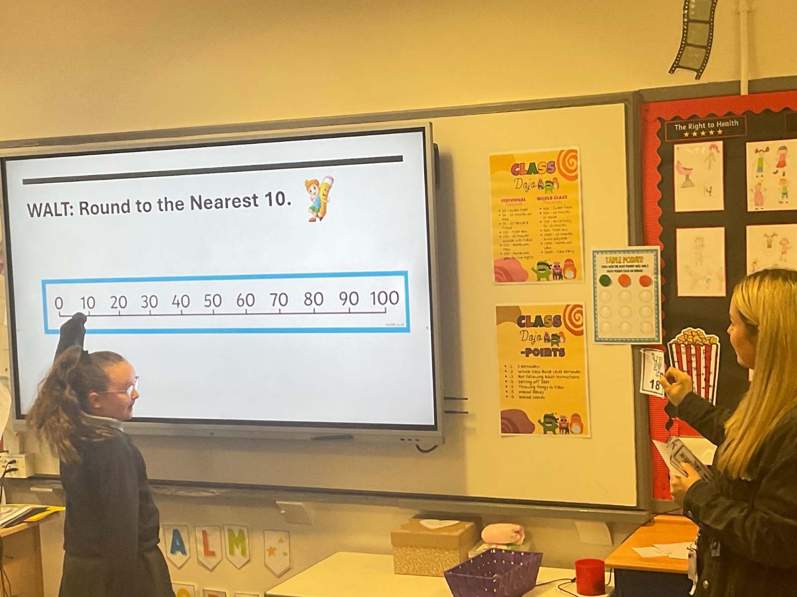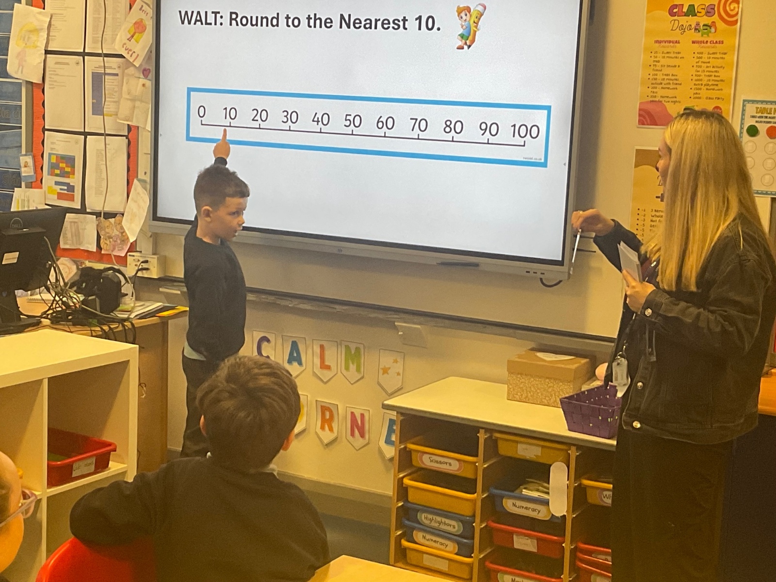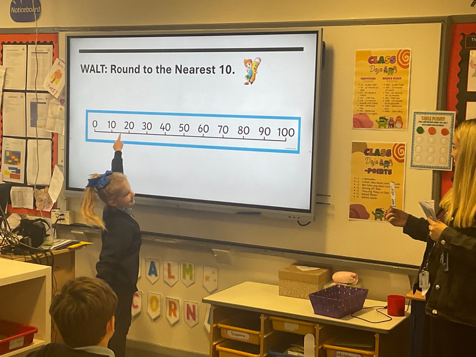 This week we learned all about rounding to the nearest 10. To help us practice, Mrs O’Hare invited us up to the board. She held up a number, and we had to point to the place on the number line that showed which 10 it rounded to.