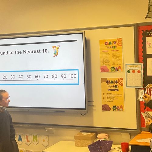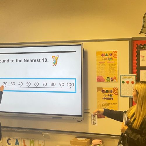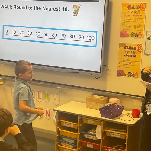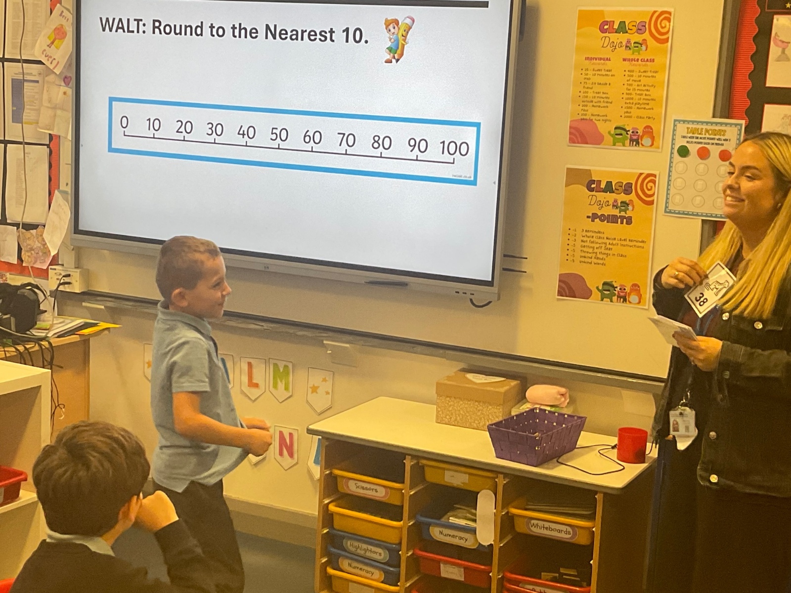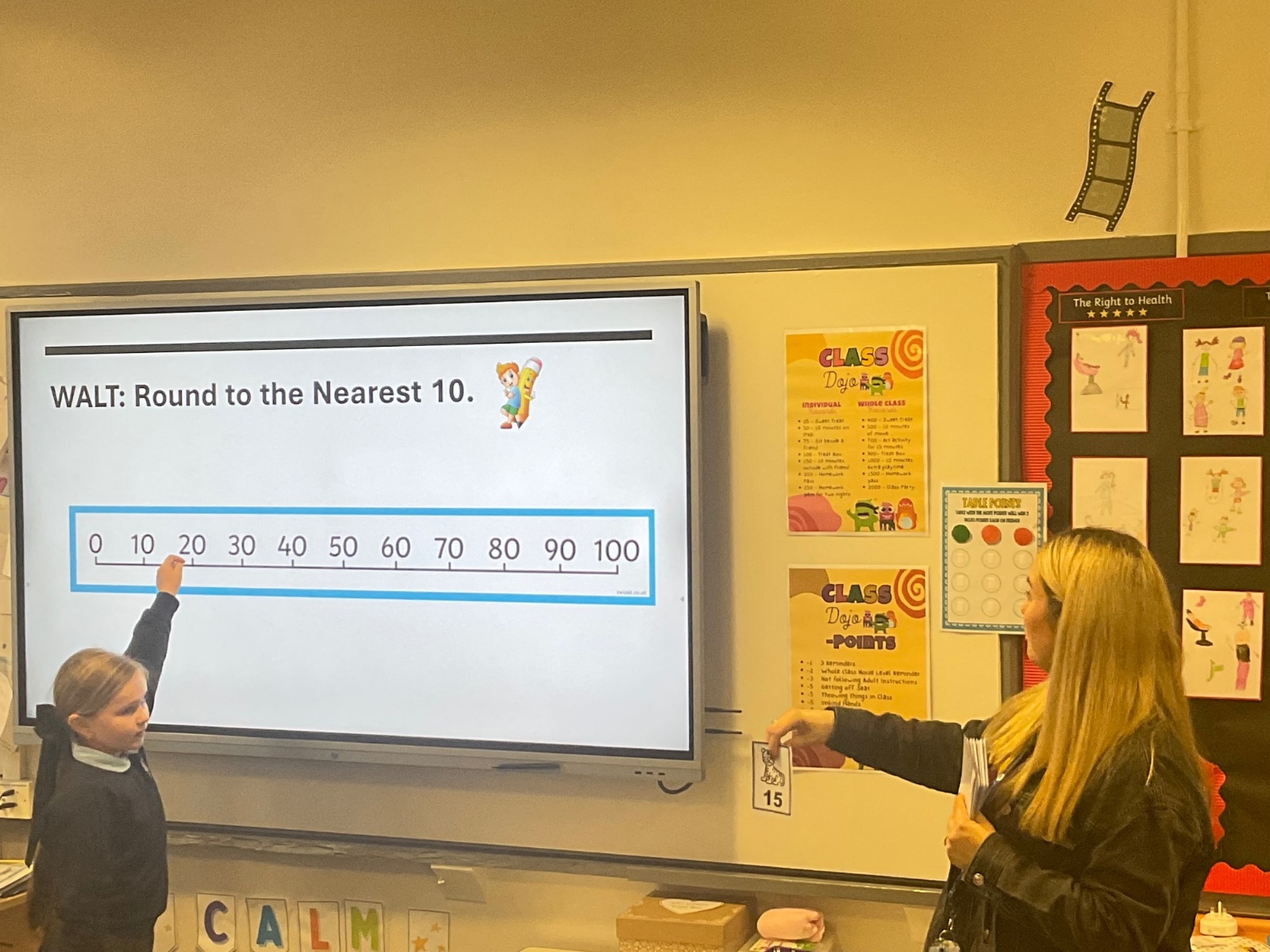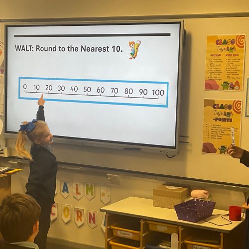 This week we learned all about rounding to the nearest 10. To help us practice, Mrs O’Hare invited us up to the board. She held up a number, and we had to point to the place on the number line that showed which 10 it rounded to.