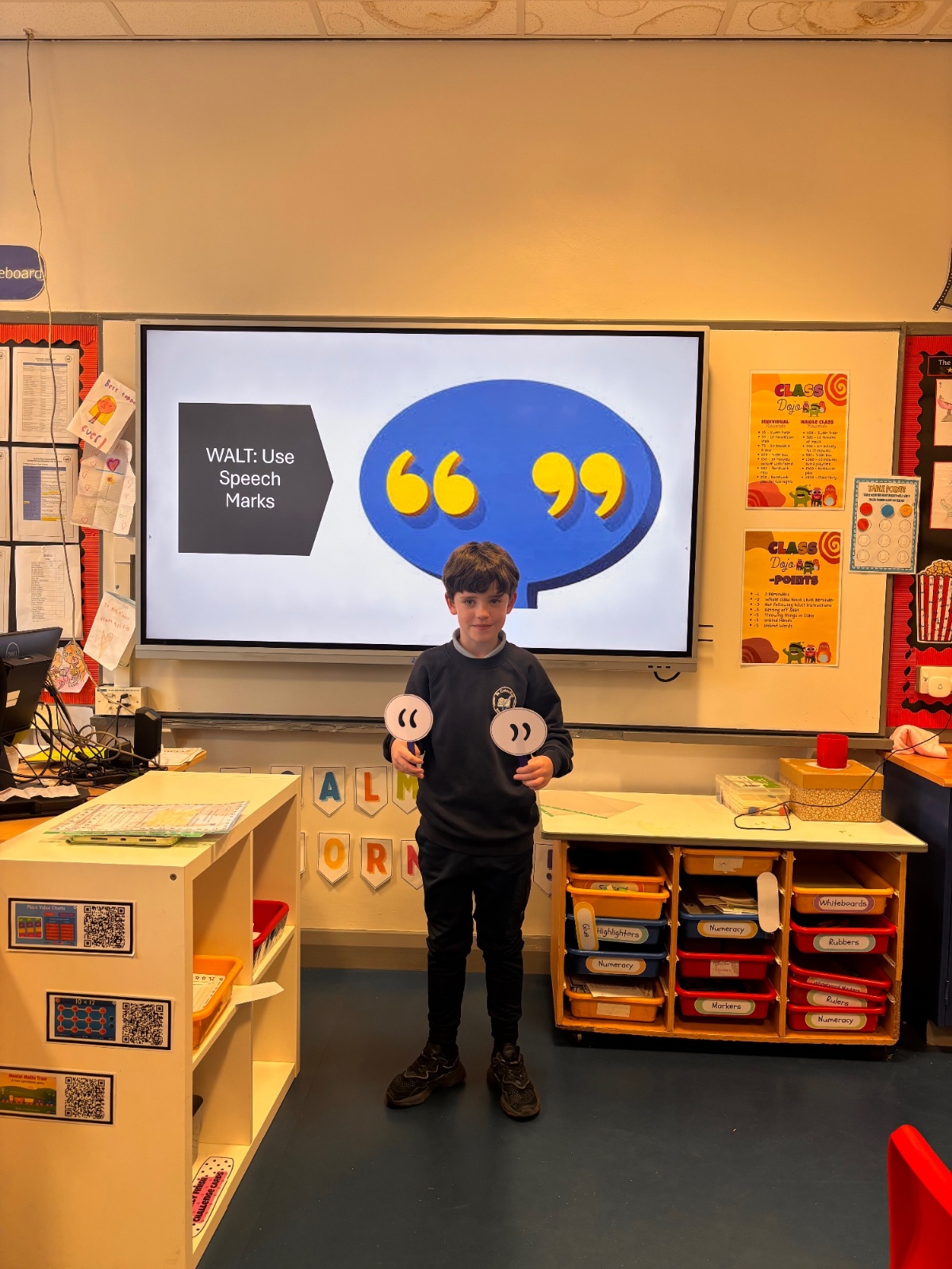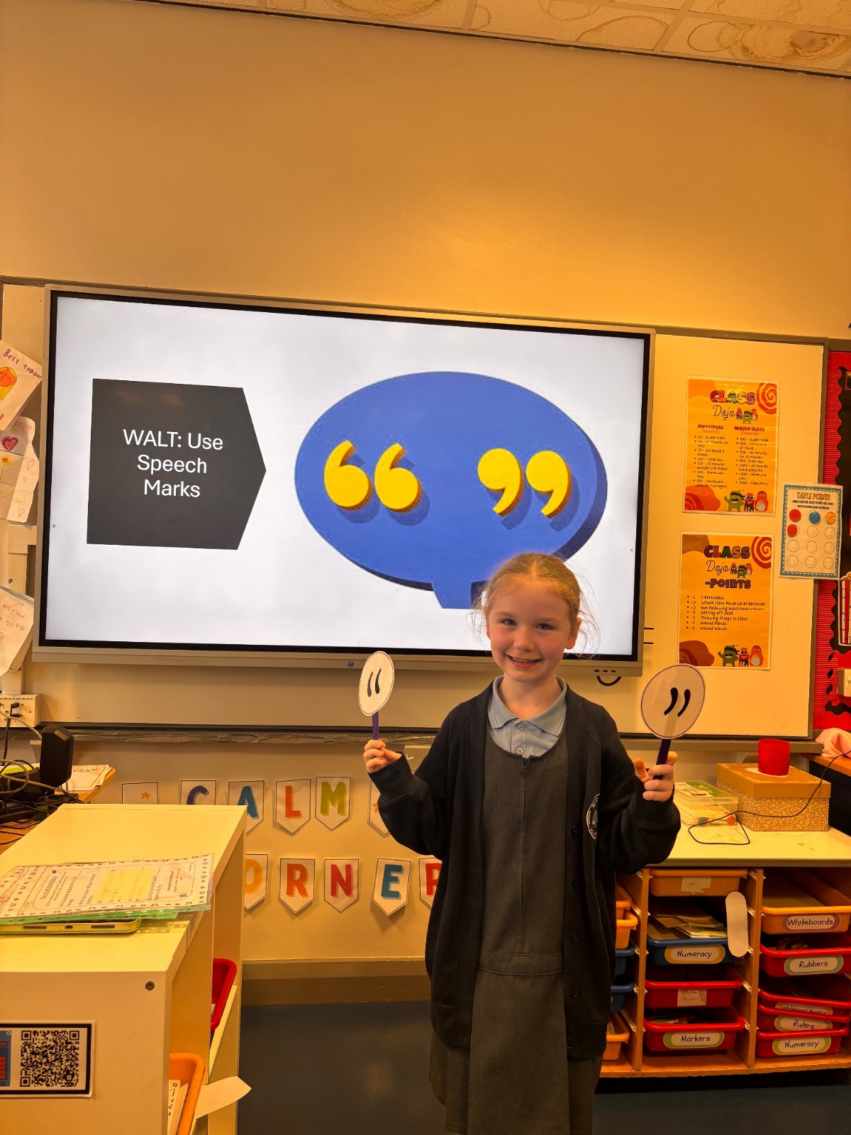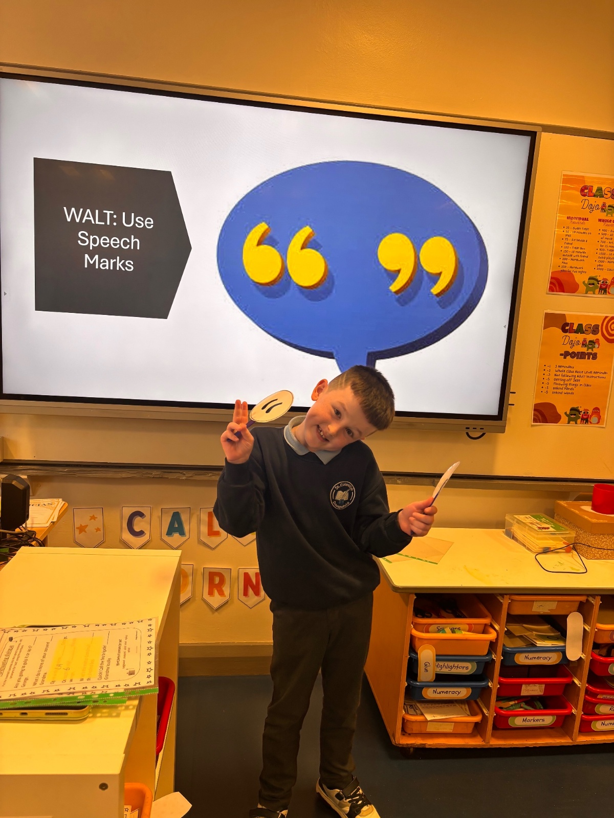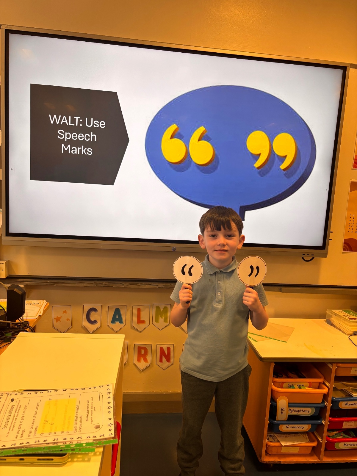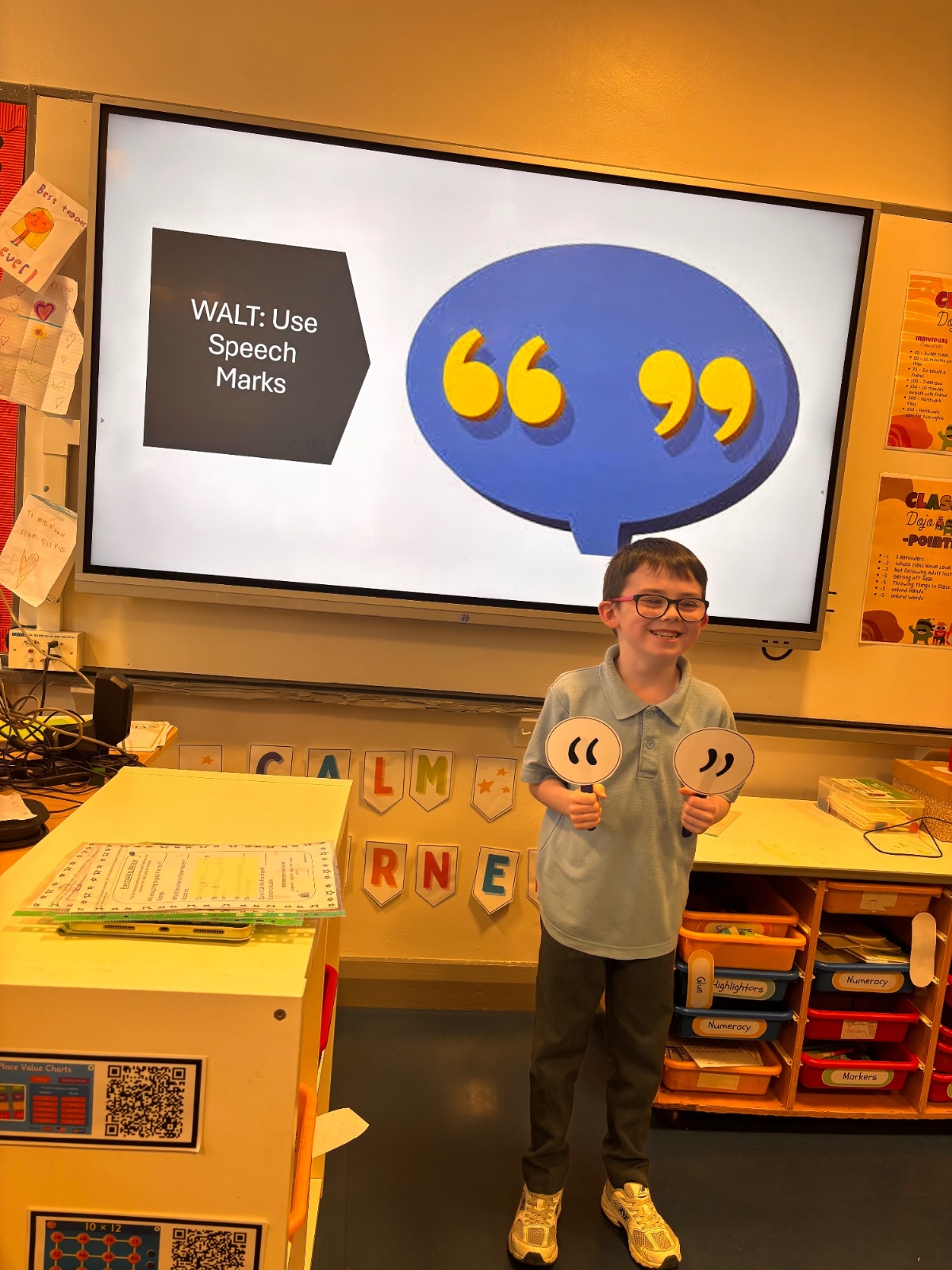To help us learn about speech marks, we used cut-out quotation marks to show when someone was speaking. We held them up whenever we were “talking” in a sentence and lowered them again when we finished. After that, we explored different words we could use instead of “said” to make our writing more interesting.