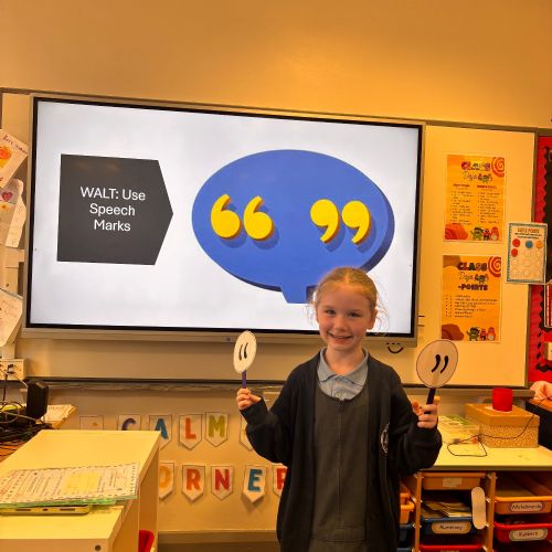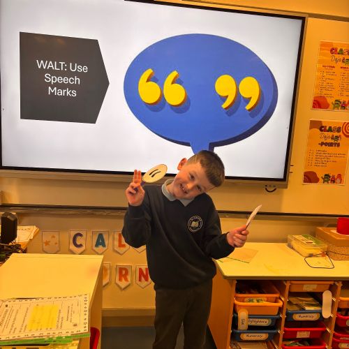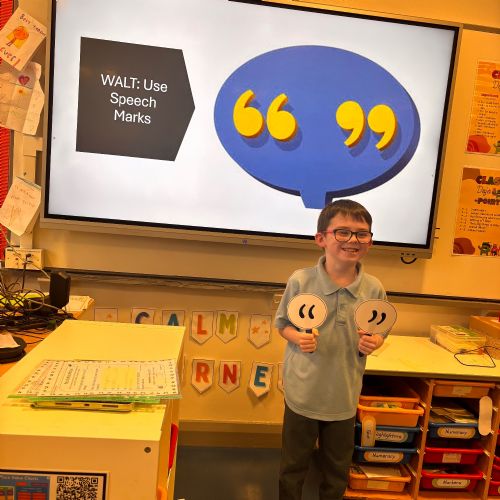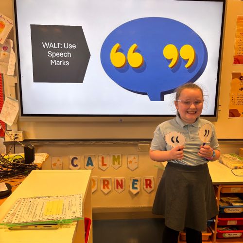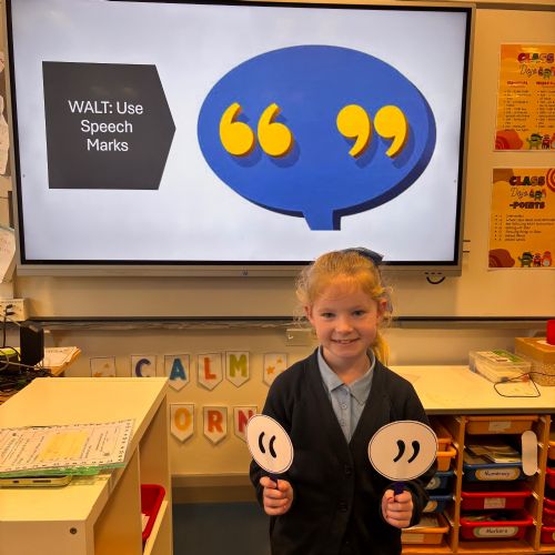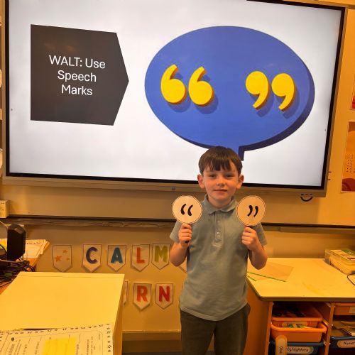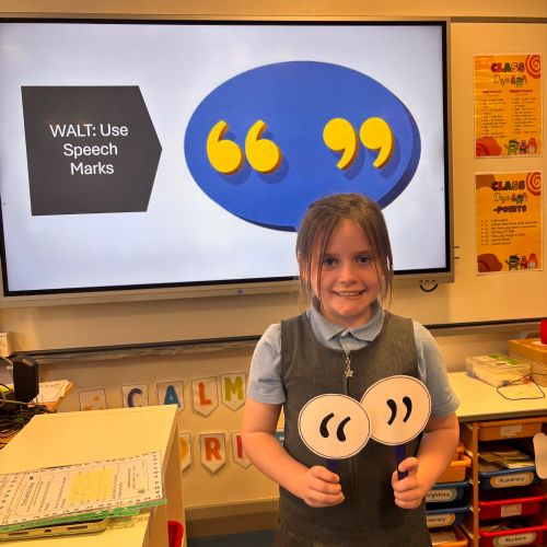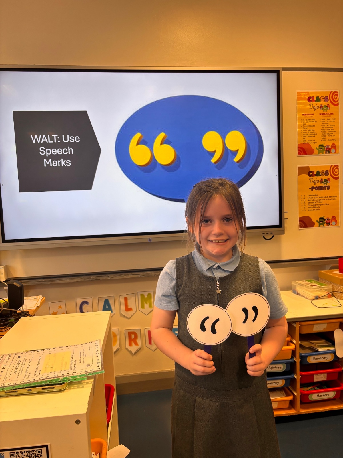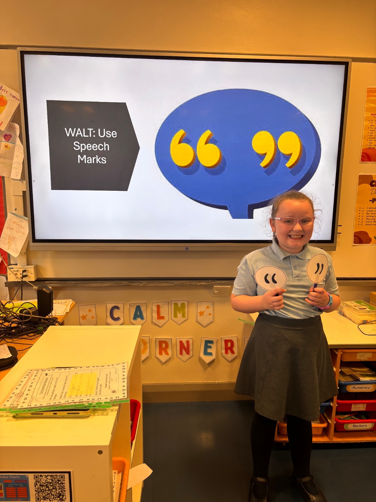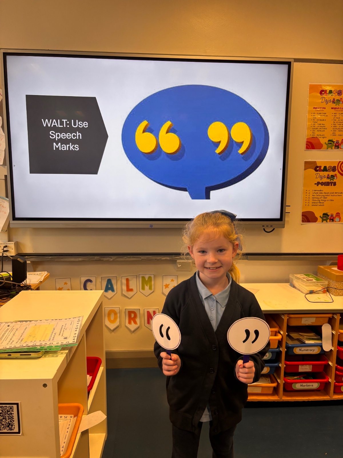 To help us learn about speech marks, we used cut-out quotation marks to show when someone was speaking. We held them up whenever we were “talking” in a sentence and lowered them again when we finished. After that, we explored different words we could use instead of “said” to make our writing more interesting.