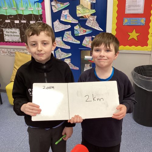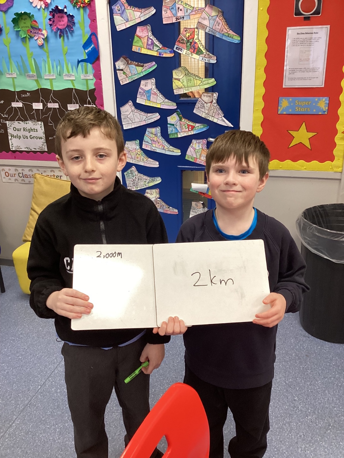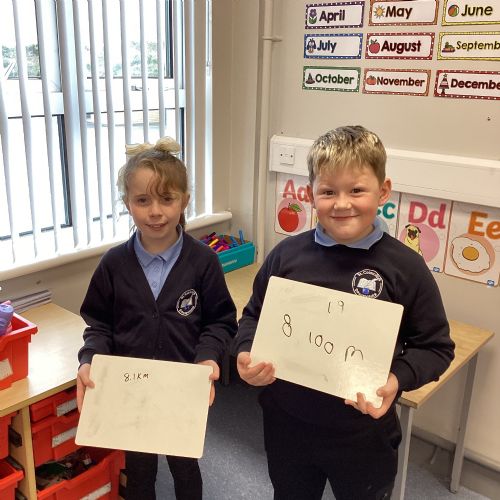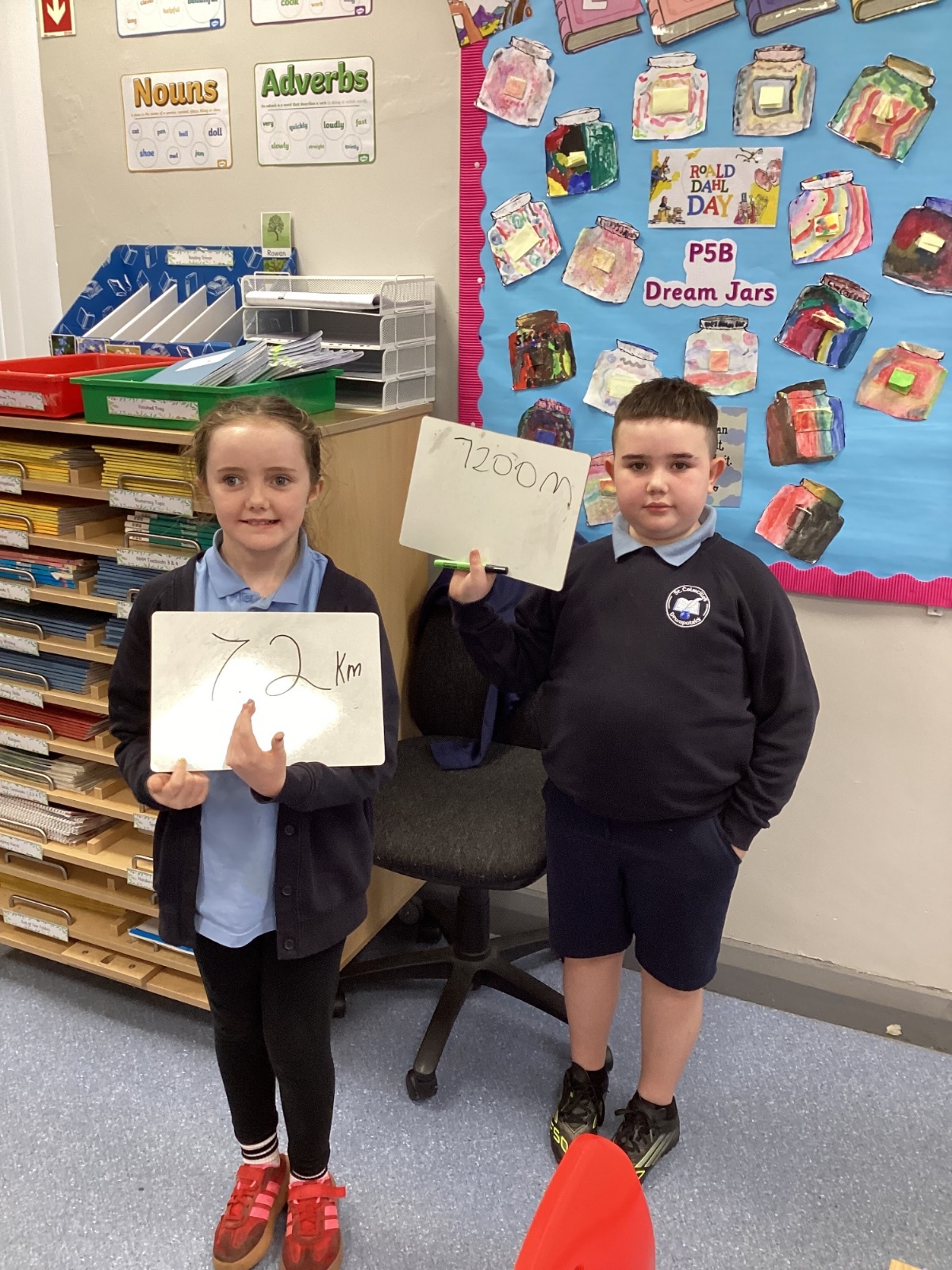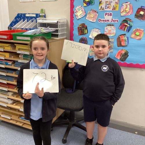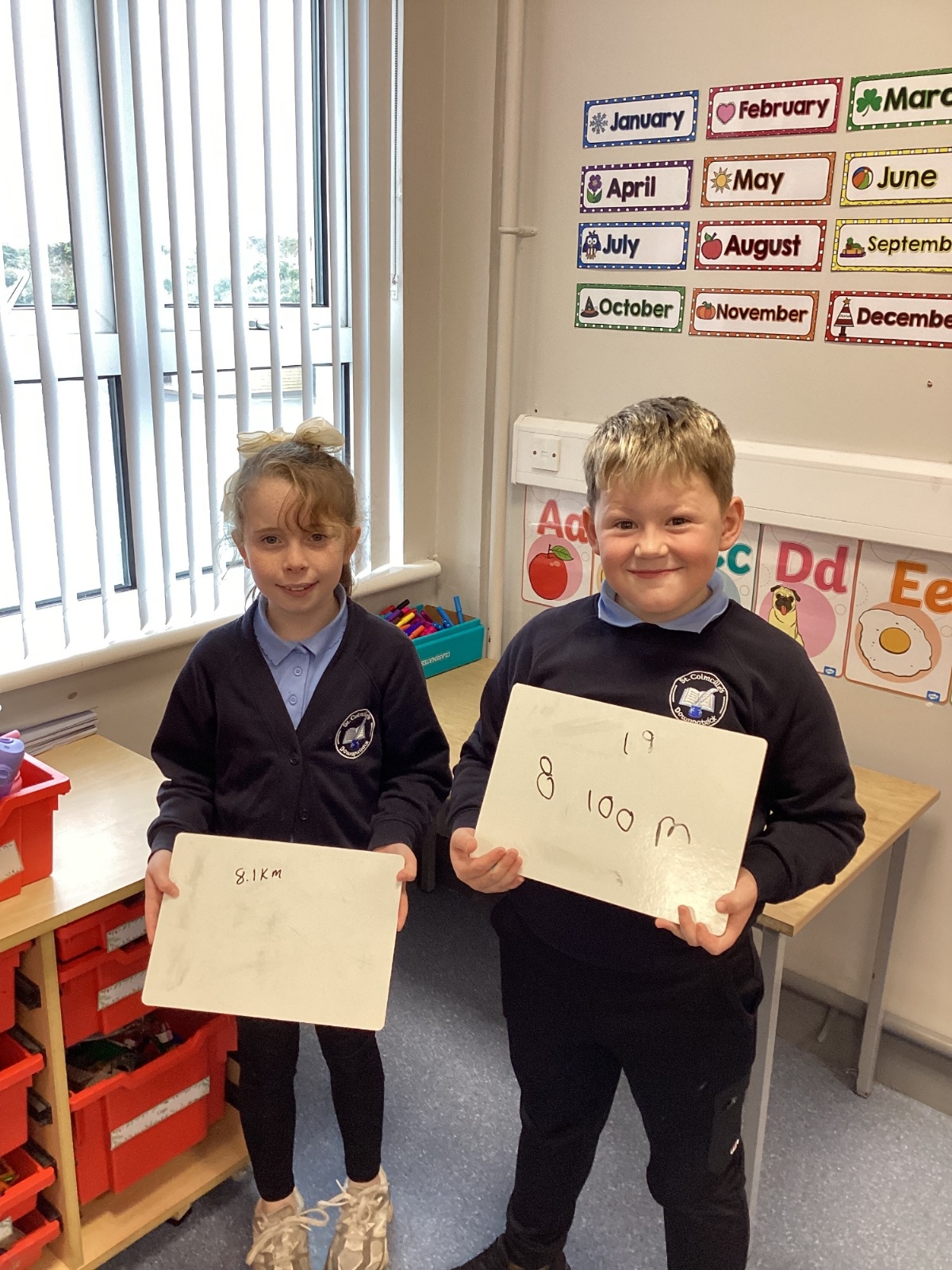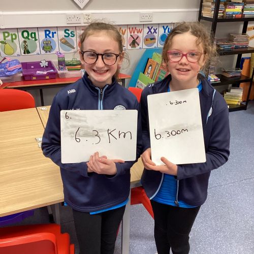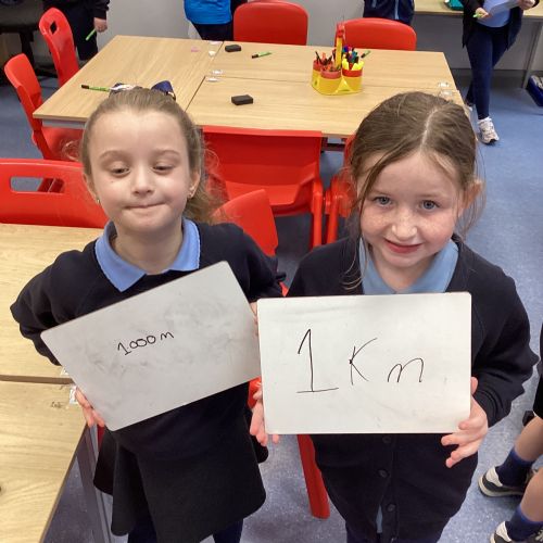 Our Primary 5 pupils have been exploring how to convert kilometres into metres as part of their numeracy work. They learned that 1 kilometre equals 1,000 metres, and used this knowledge to solve real-life problems, such as working out the distance from school to local landmarks. To make learning fun and interactive, pupils also took part in a matching activity where they had to find another classmate with an equivalent measurement to their own. This hands-on approach helped reinforce understanding and encouraged teamwork while building confidence in applying maths beyond the classroom.