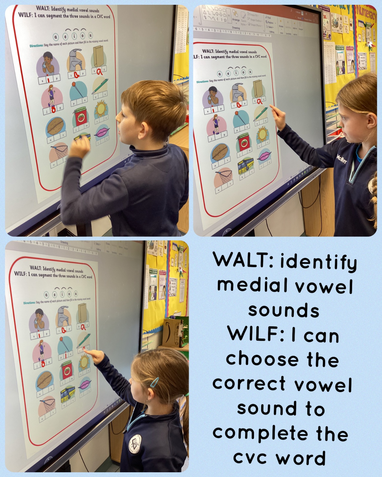 We are learning to identify vowel sounds. We played games to identify the medial vowel sounds in CVC words.