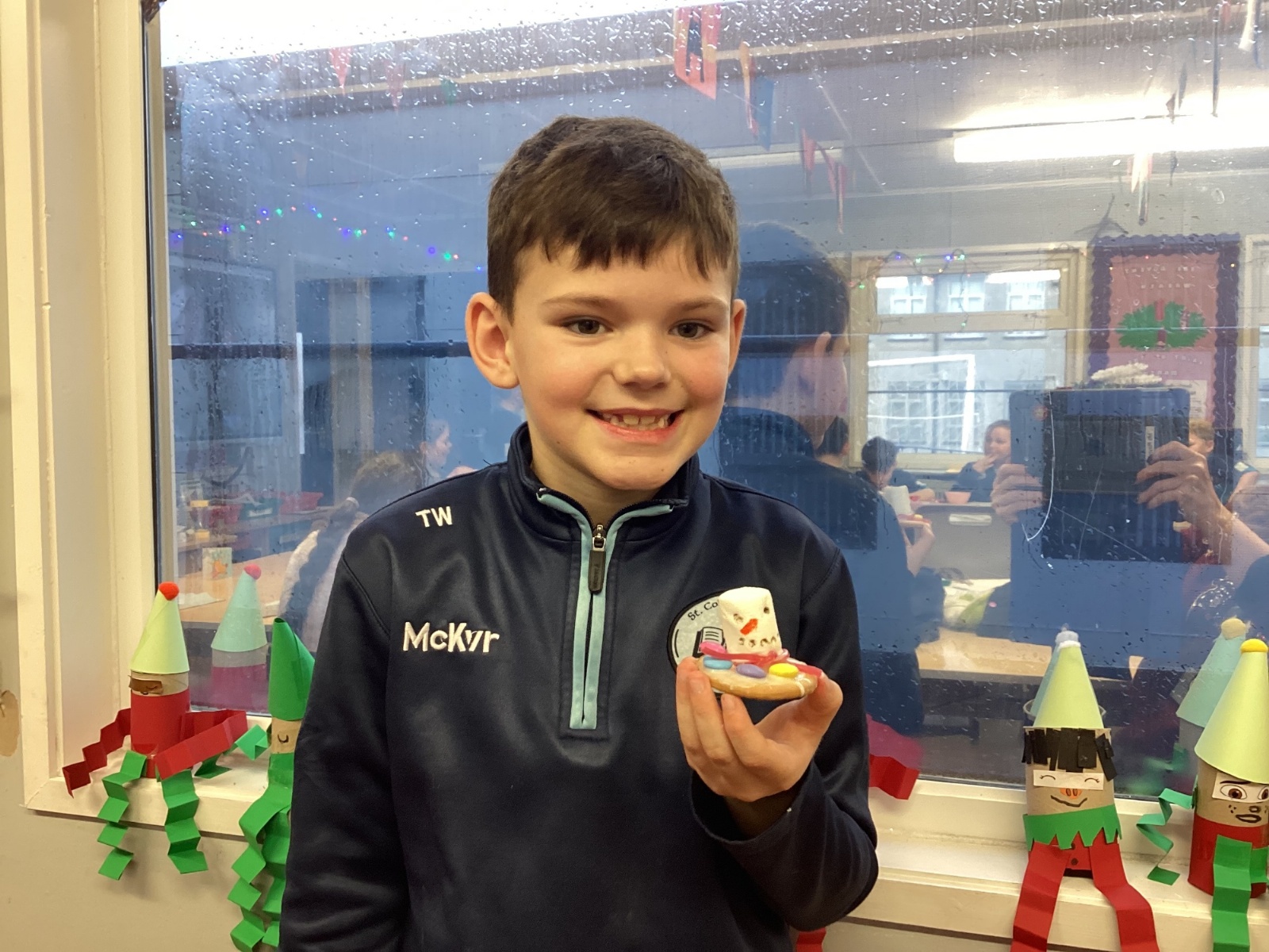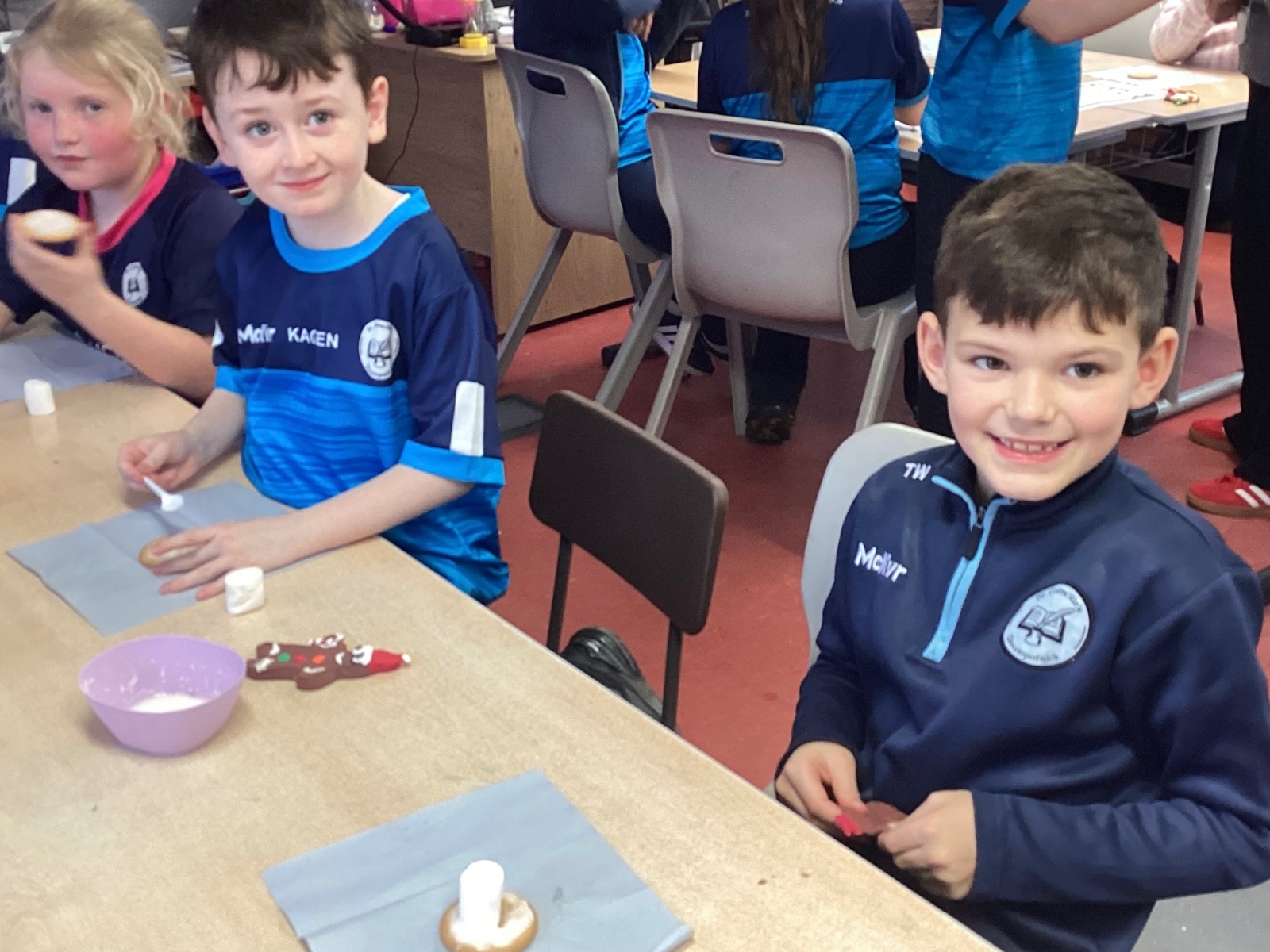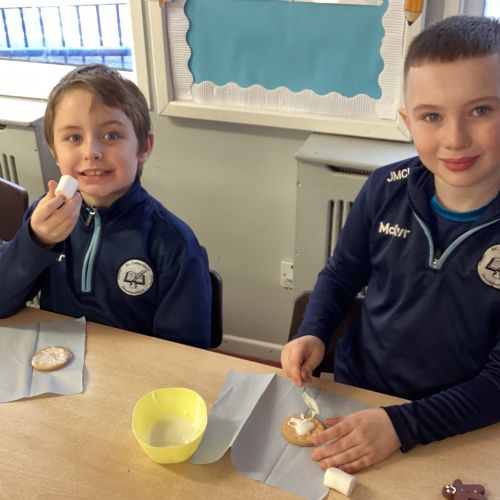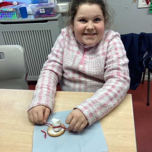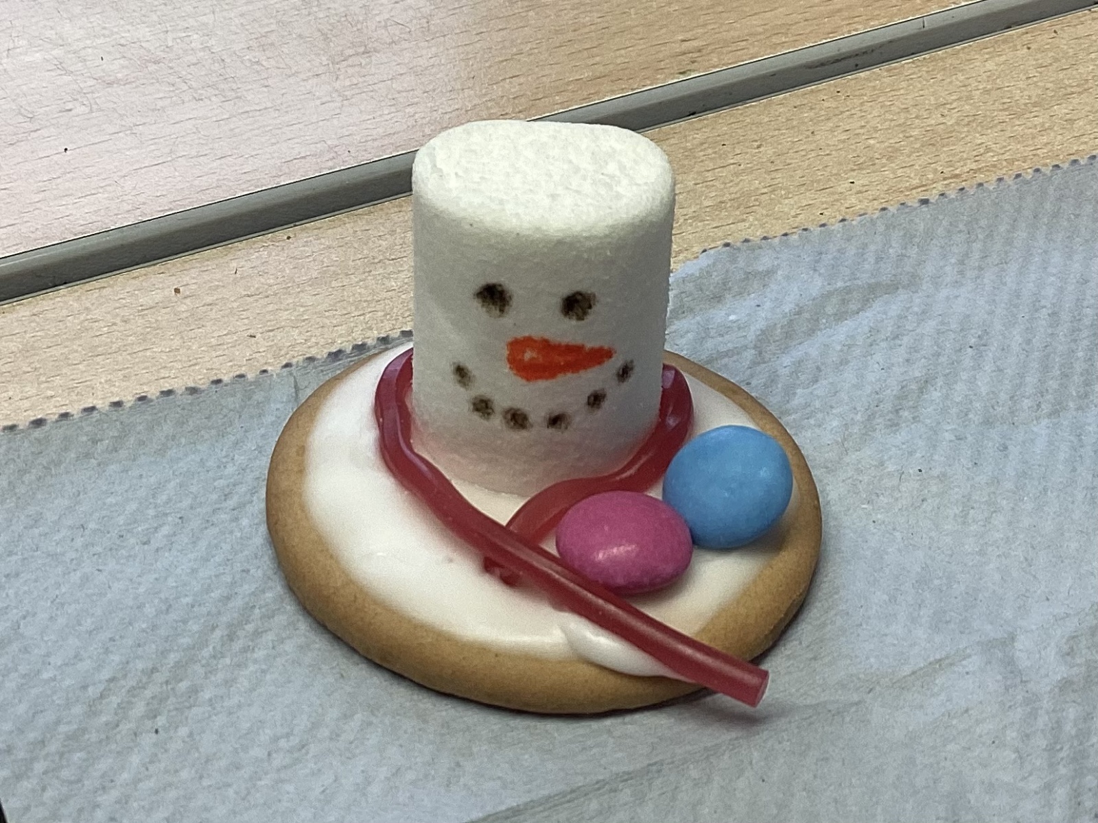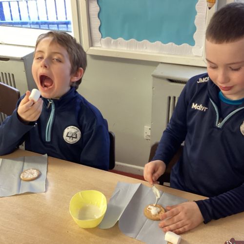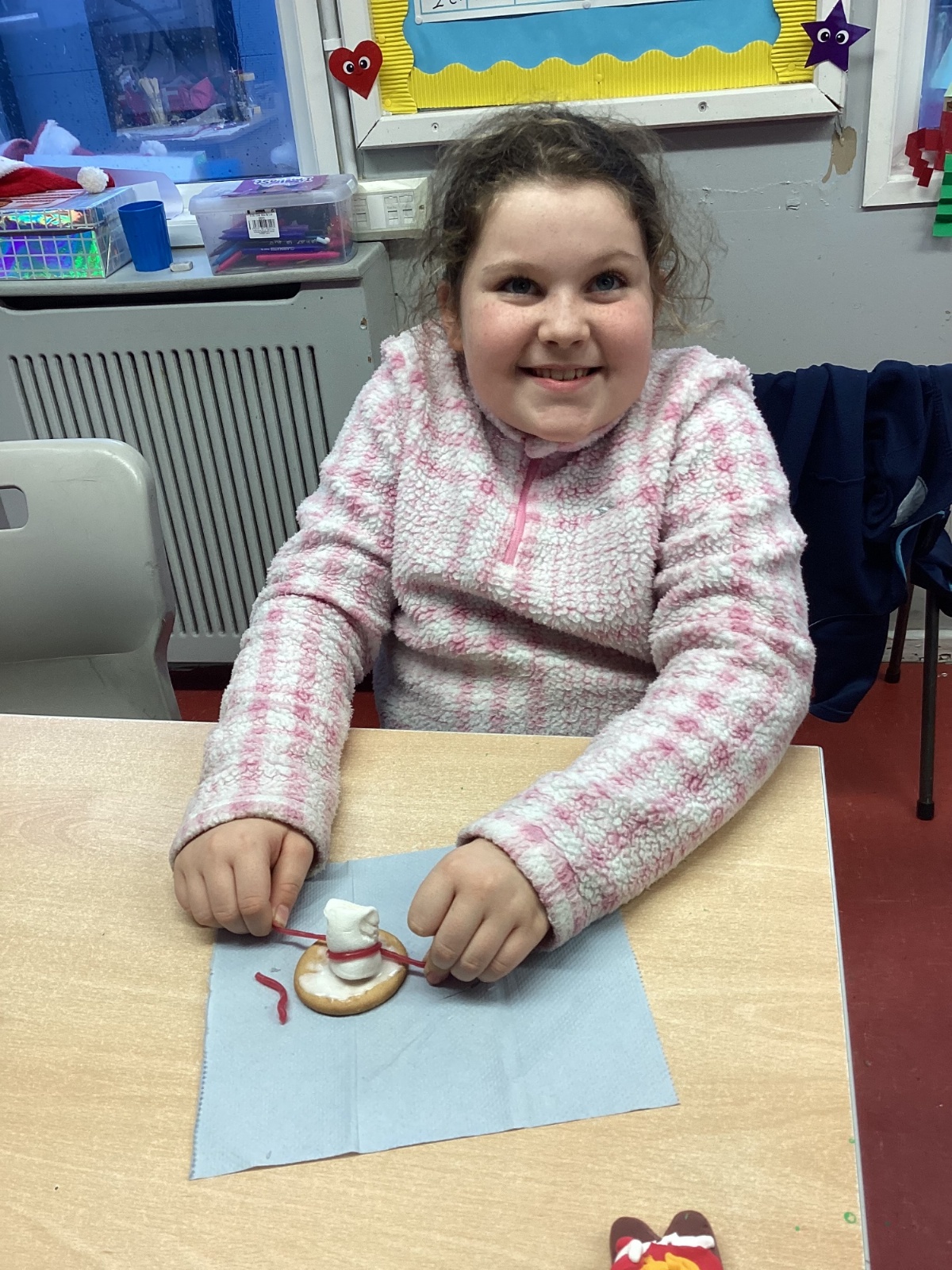 Today, P5 made melting snowman biscuits. We started with a plain biscuit, added icing to look like melted snow, popped a marshmallow on top for the snowman’s head, and used edible markers to give him a face. Then came the finishing touches: strawberry laces and Smarties for decoration. It’s safe to say these snowmen didn’t last long…
