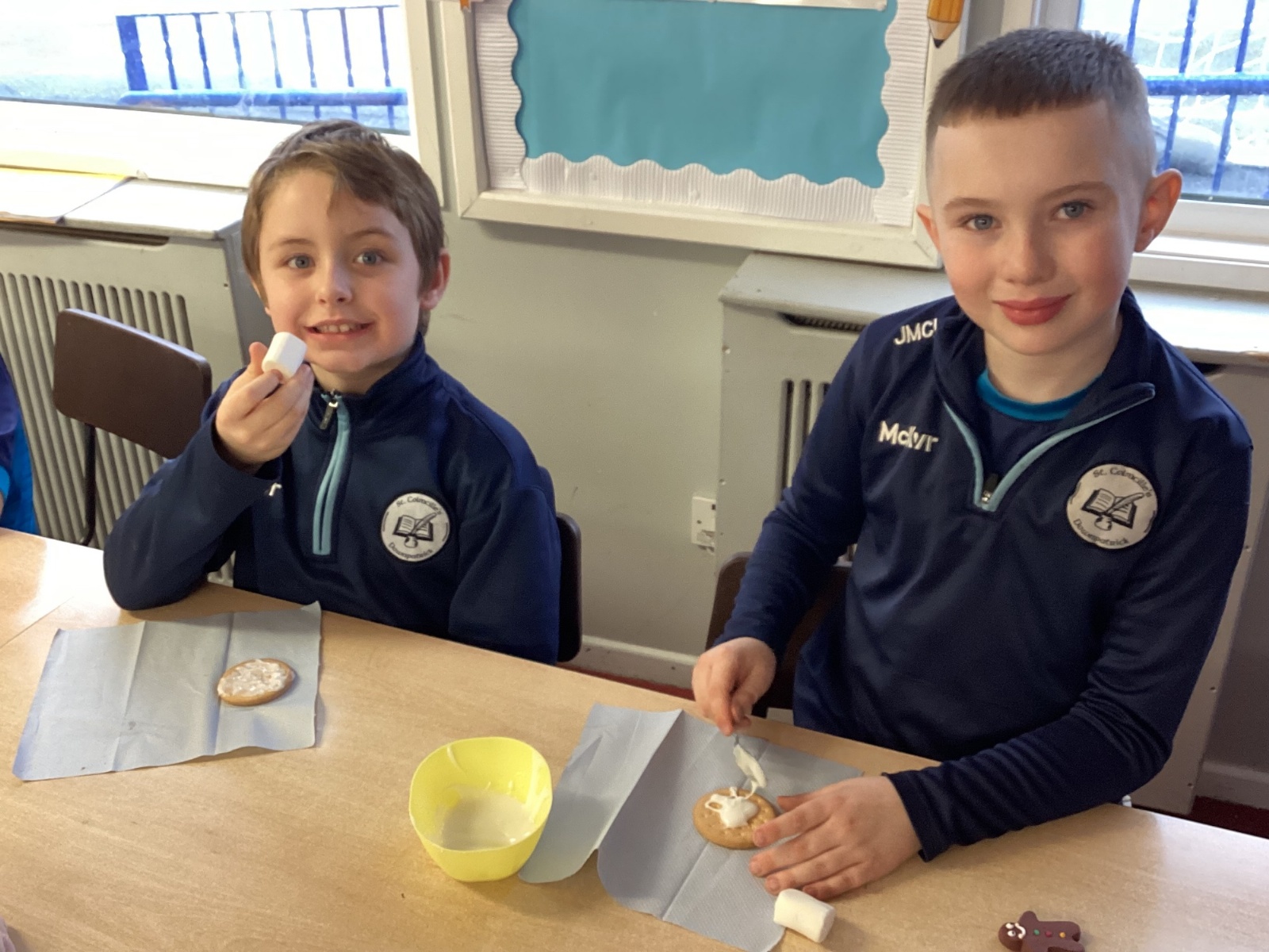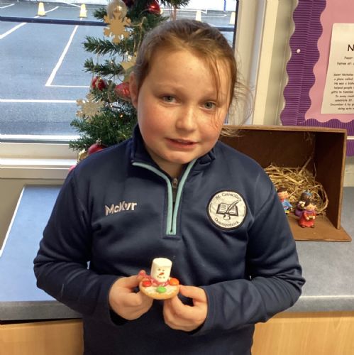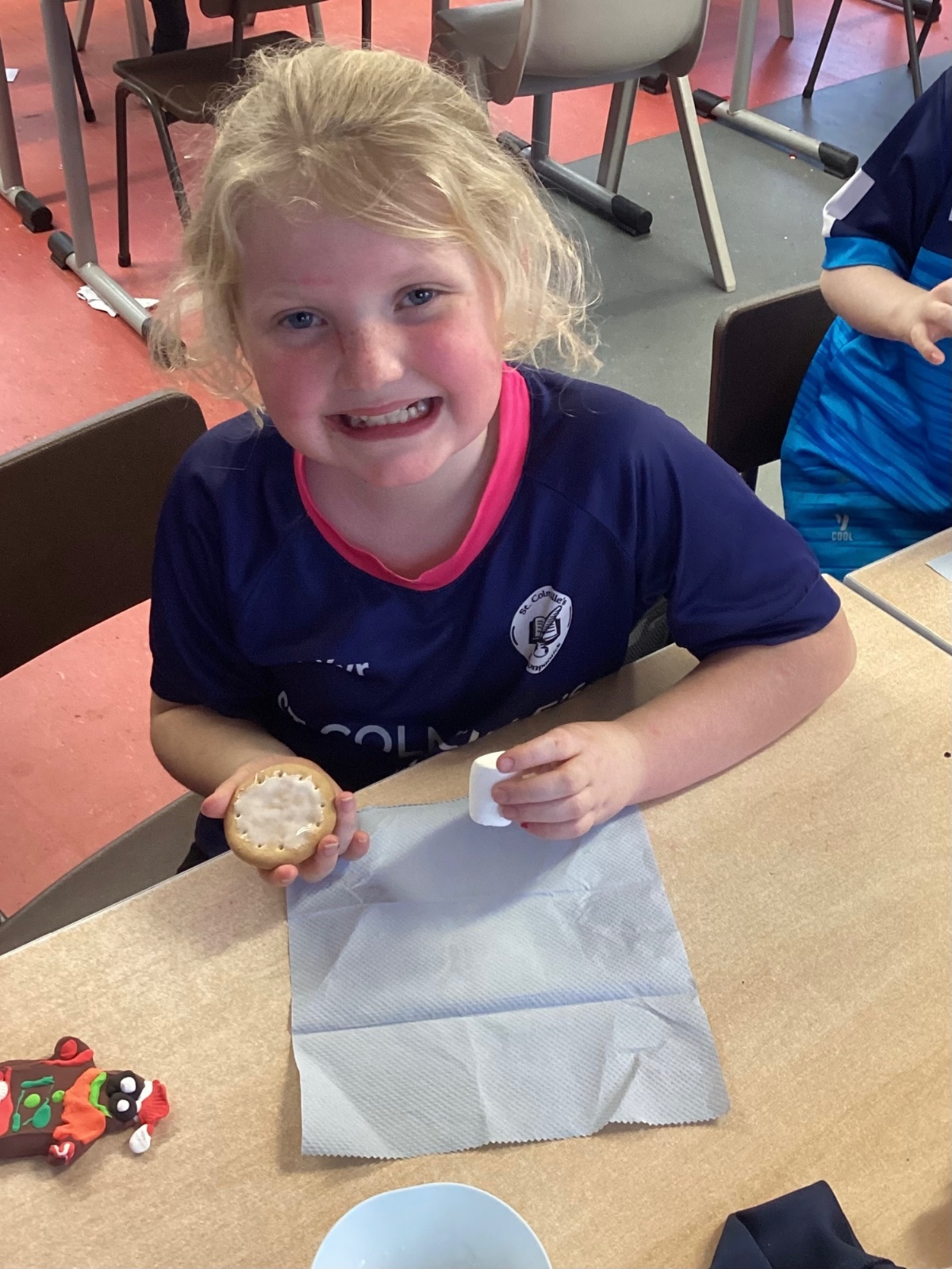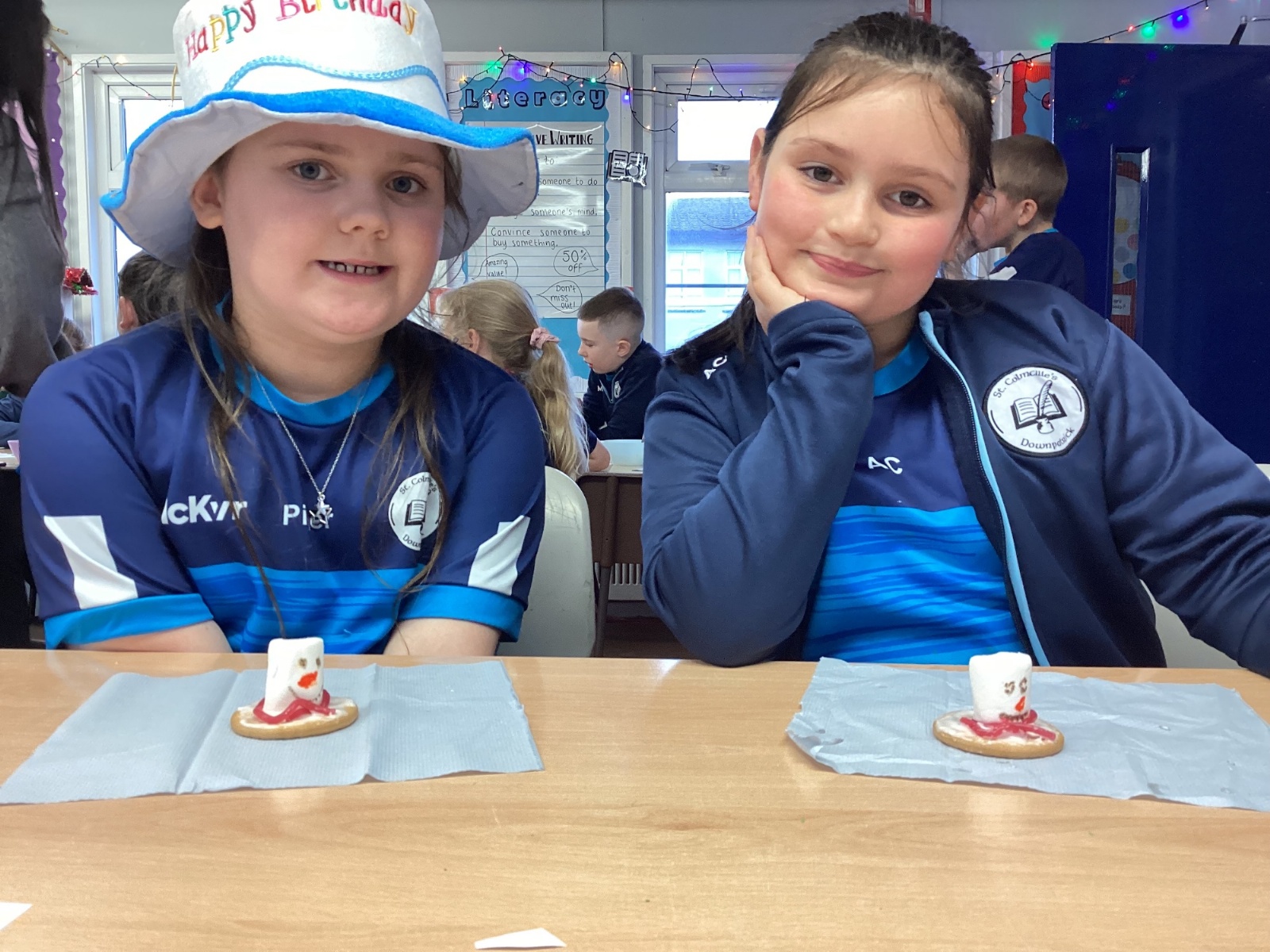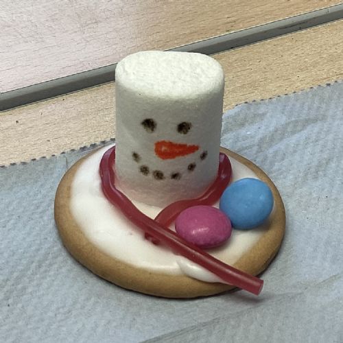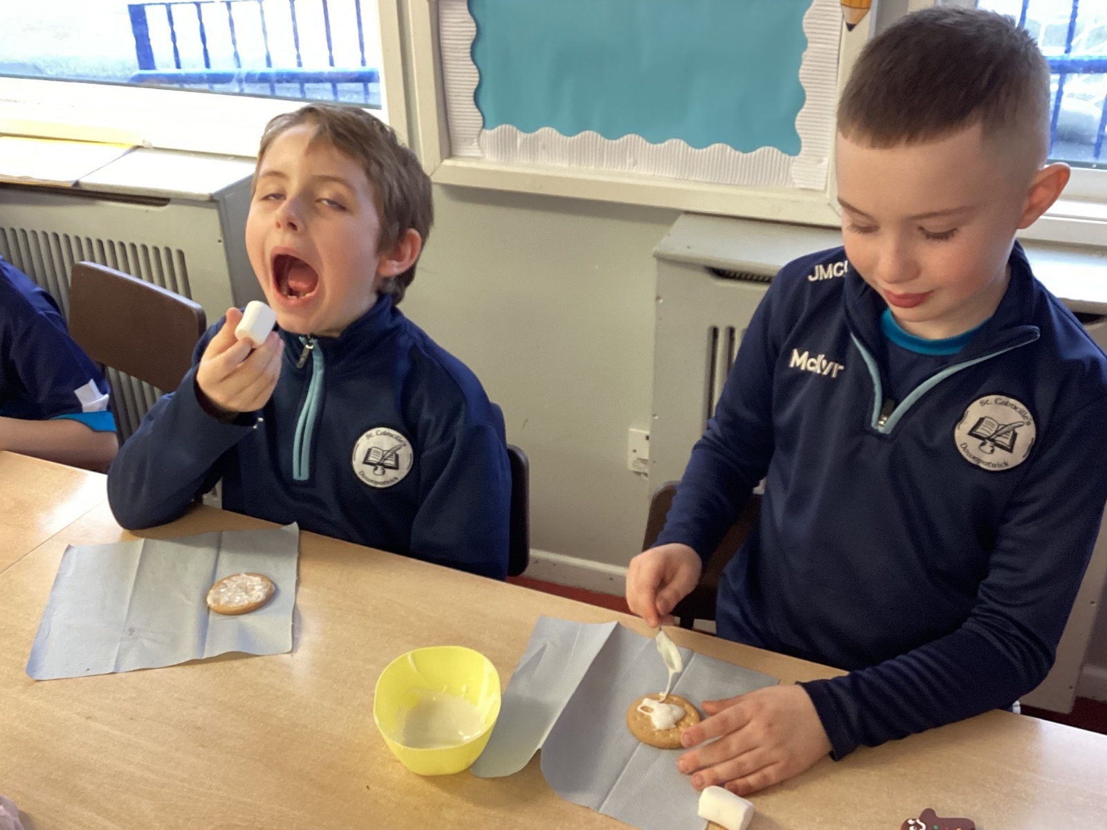 Today, P5 made melting snowman biscuits. We started with a plain biscuit, added icing to look like melted snow, popped a marshmallow on top for the snowman’s head, and used edible markers to give him a face. Then came the finishing touches: strawberry laces and Smarties for decoration. It’s safe to say these snowmen didn’t last long…