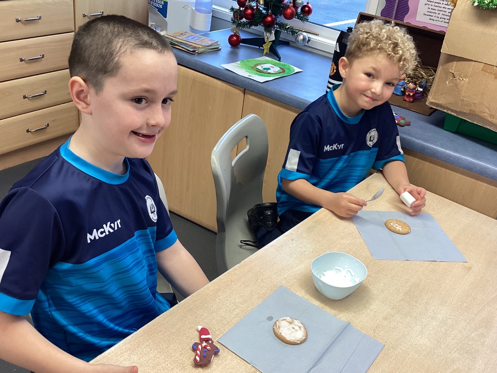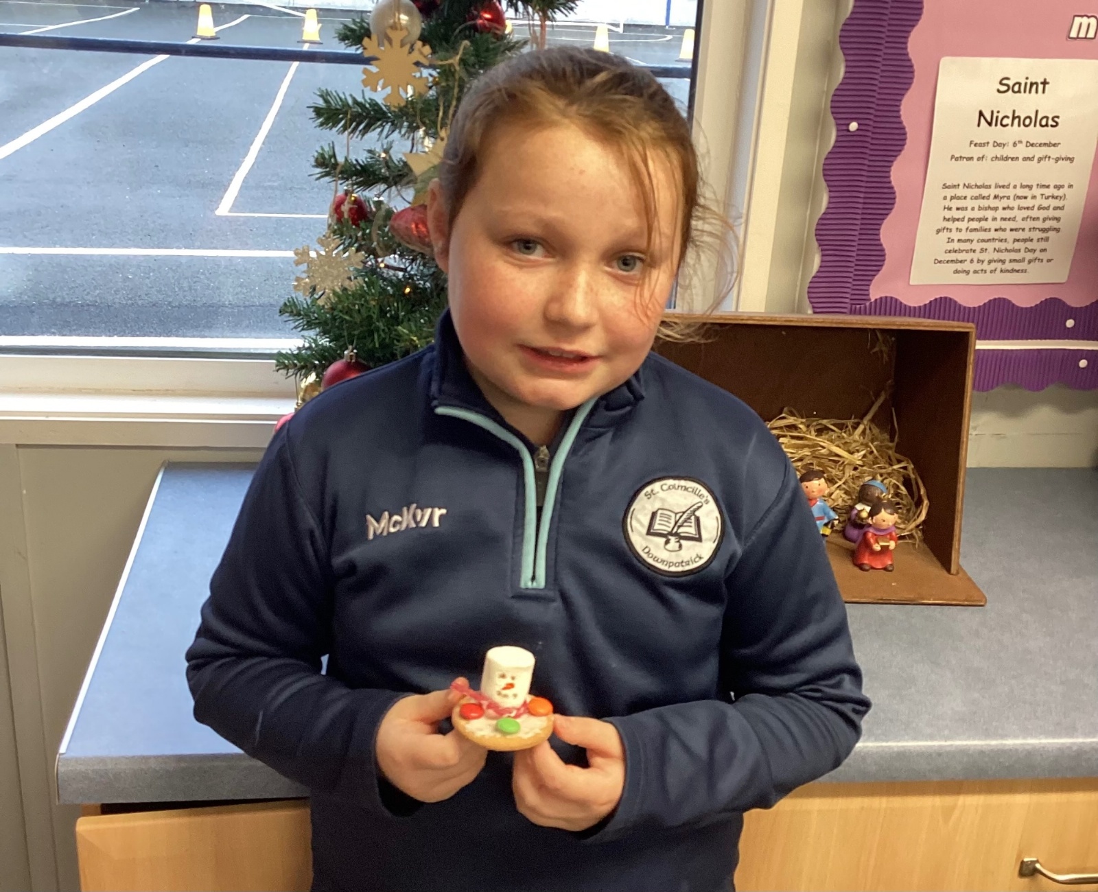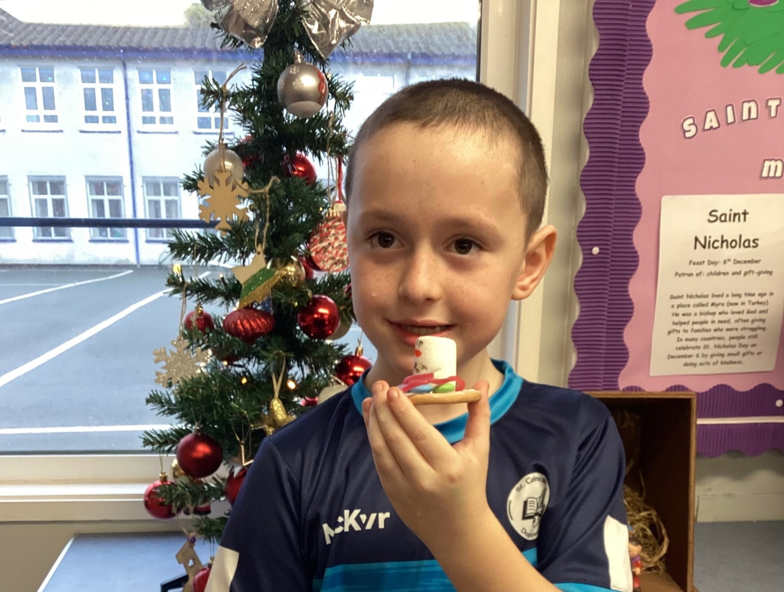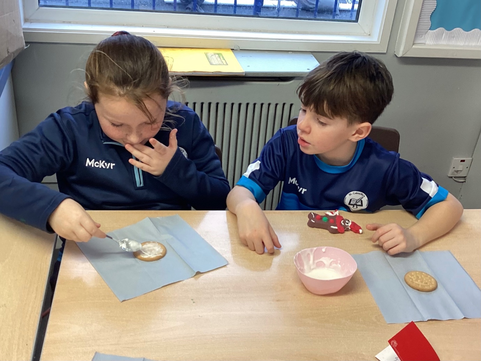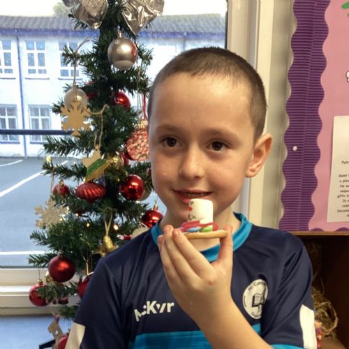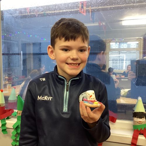 Today, P5 made melting snowman biscuits. We started with a plain biscuit, added icing to look like melted snow, popped a marshmallow on top for the snowman’s head, and used edible markers to give him a face. Then came the finishing touches: strawberry laces and Smarties for decoration. It’s safe to say these snowmen didn’t last long…