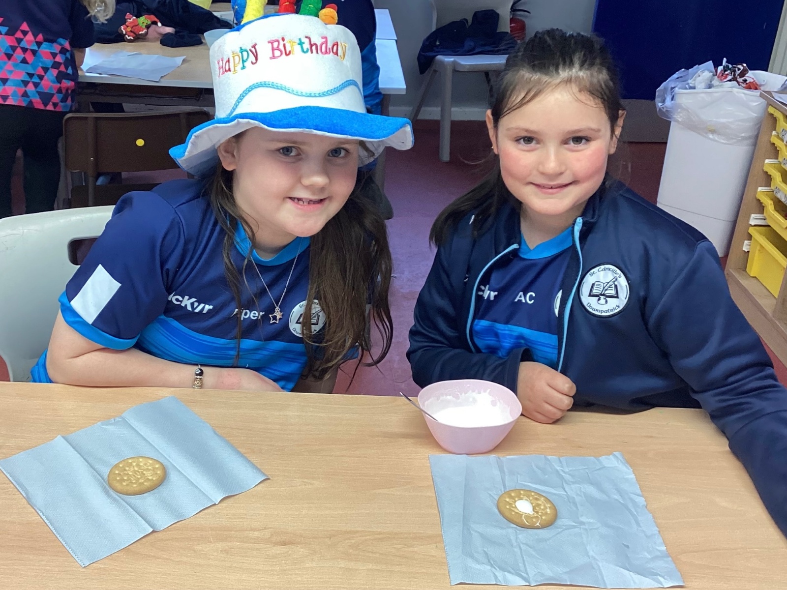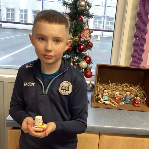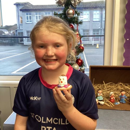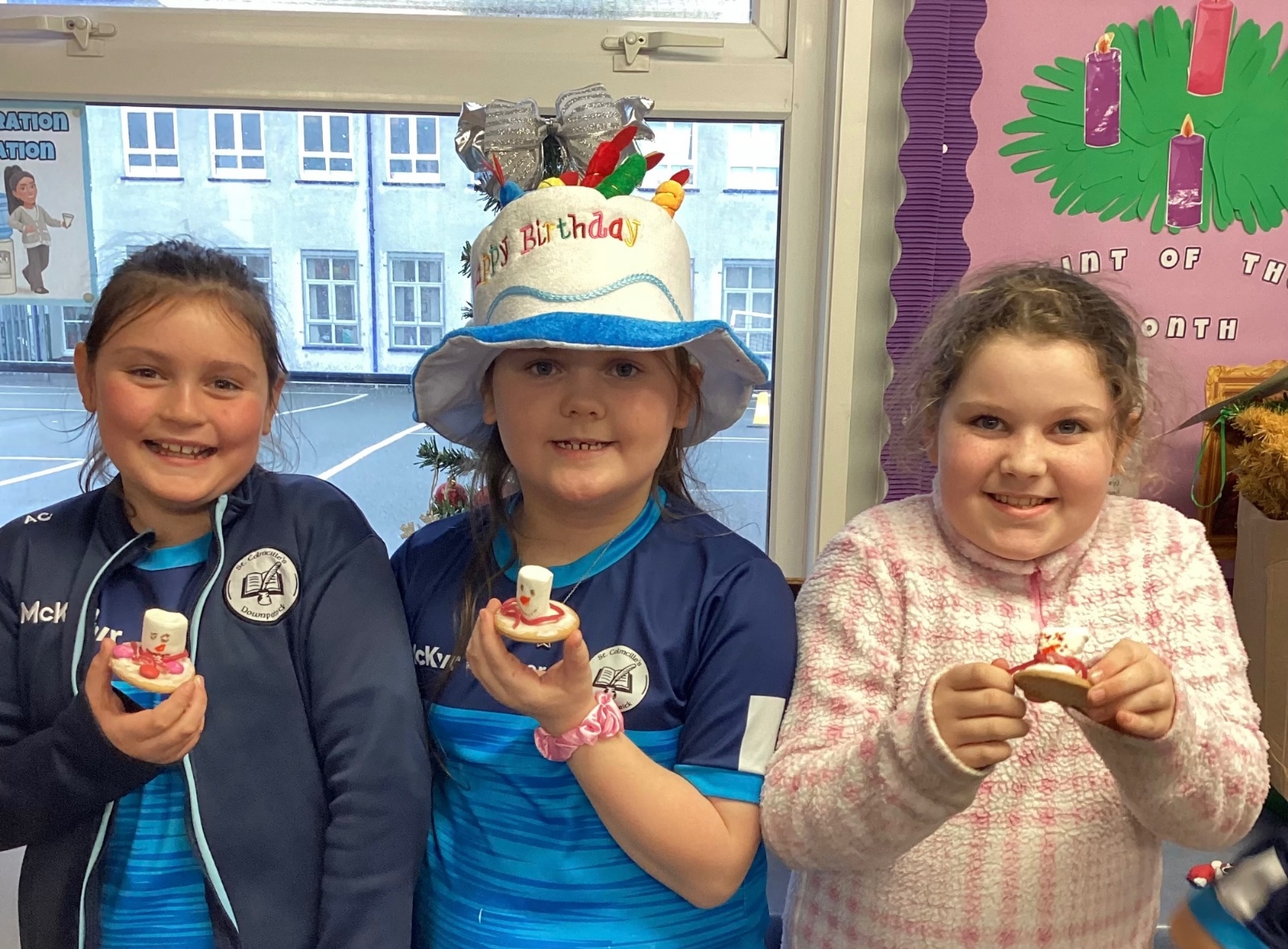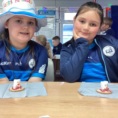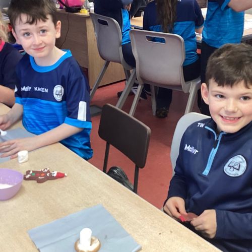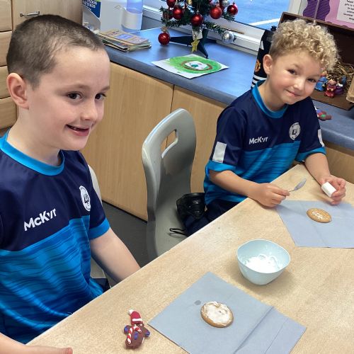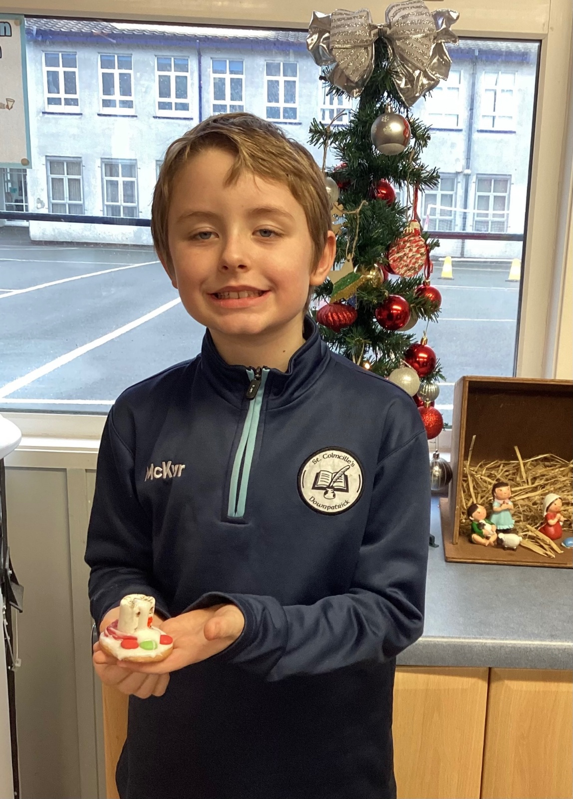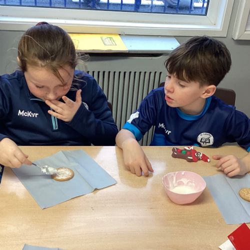 Today, P5 made melting snowman biscuits. We started with a plain biscuit, added icing to look like melted snow, popped a marshmallow on top for the snowman’s head, and used edible markers to give him a face. Then came the finishing touches: strawberry laces and Smarties for decoration. It’s safe to say these snowmen didn’t last long…