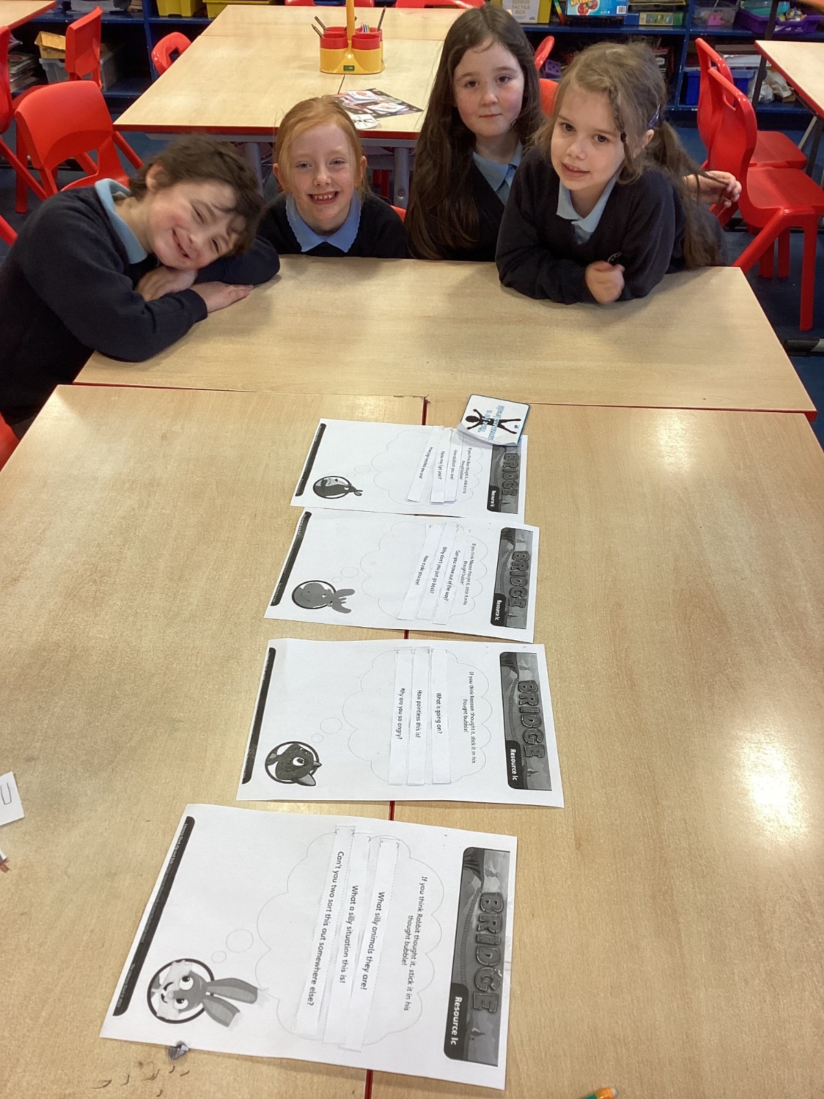 This week, the children have been working on their teamwork and comprehension skills through an engaging activity based on the story “The Bridge.” They collaborated to explore what the characters might have been thinking and saying, using thought and speech bubbles to bring the story to life. This activity encouraged them to consider different perspectives, express ideas creatively, and work together to share their interpretations.