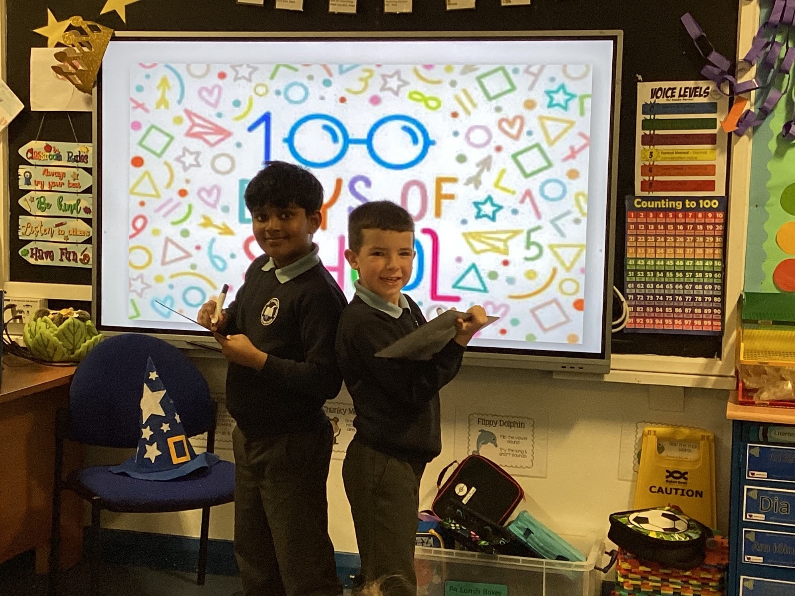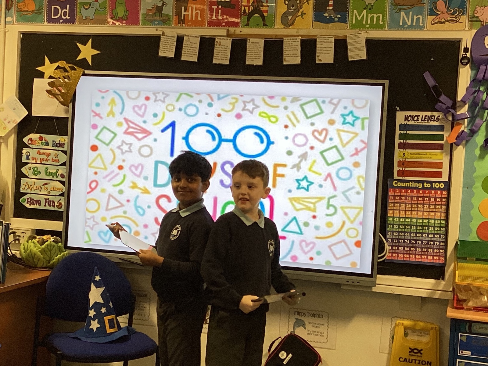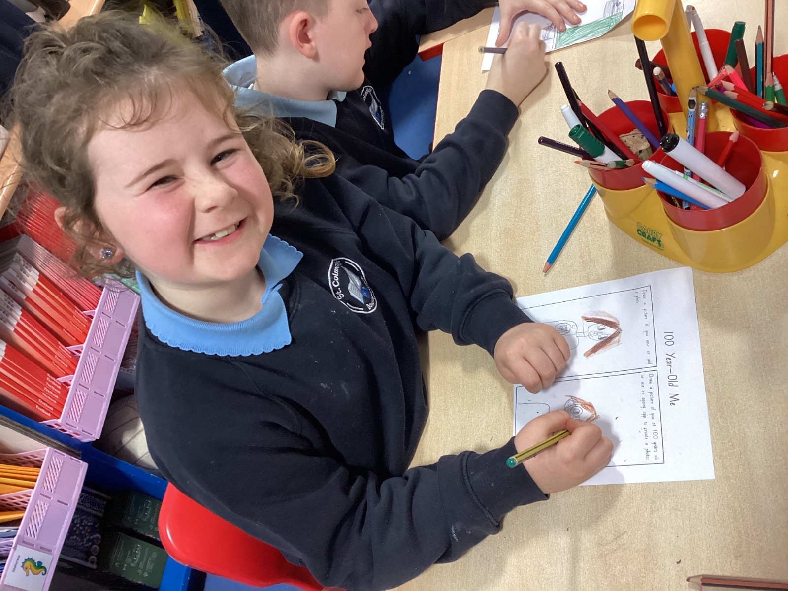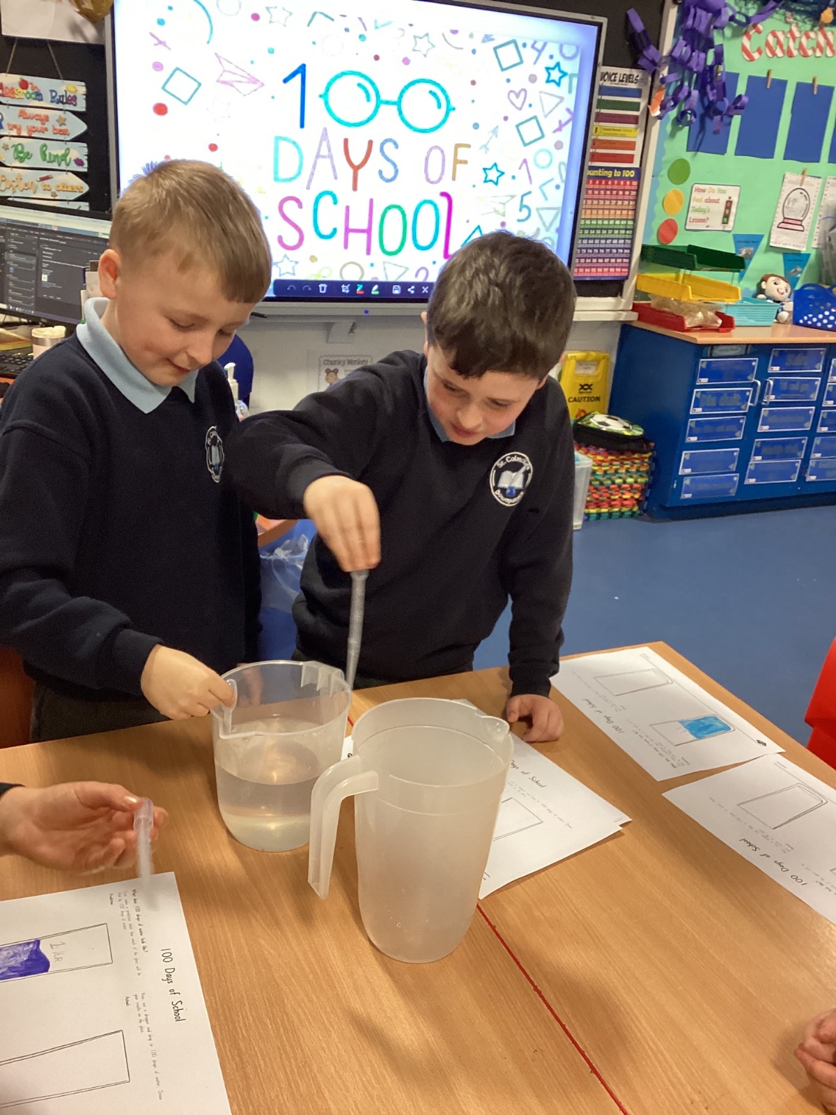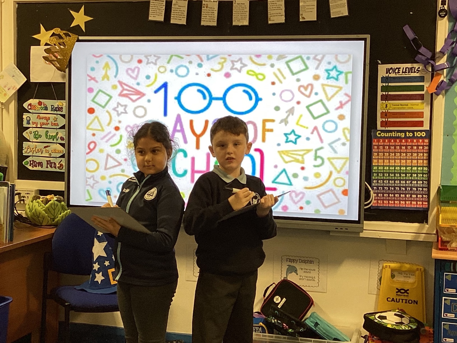 P4B took part in a range of fun activities to celebrate 100 days of school including estimating and counting 100 drops of water, creating self-portraits in 100 years time and taking part in a mental maths quiz!