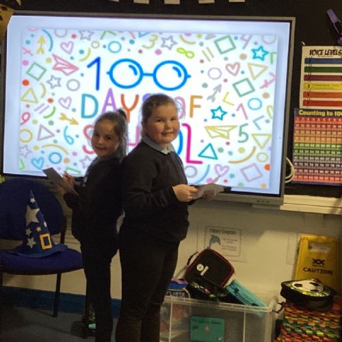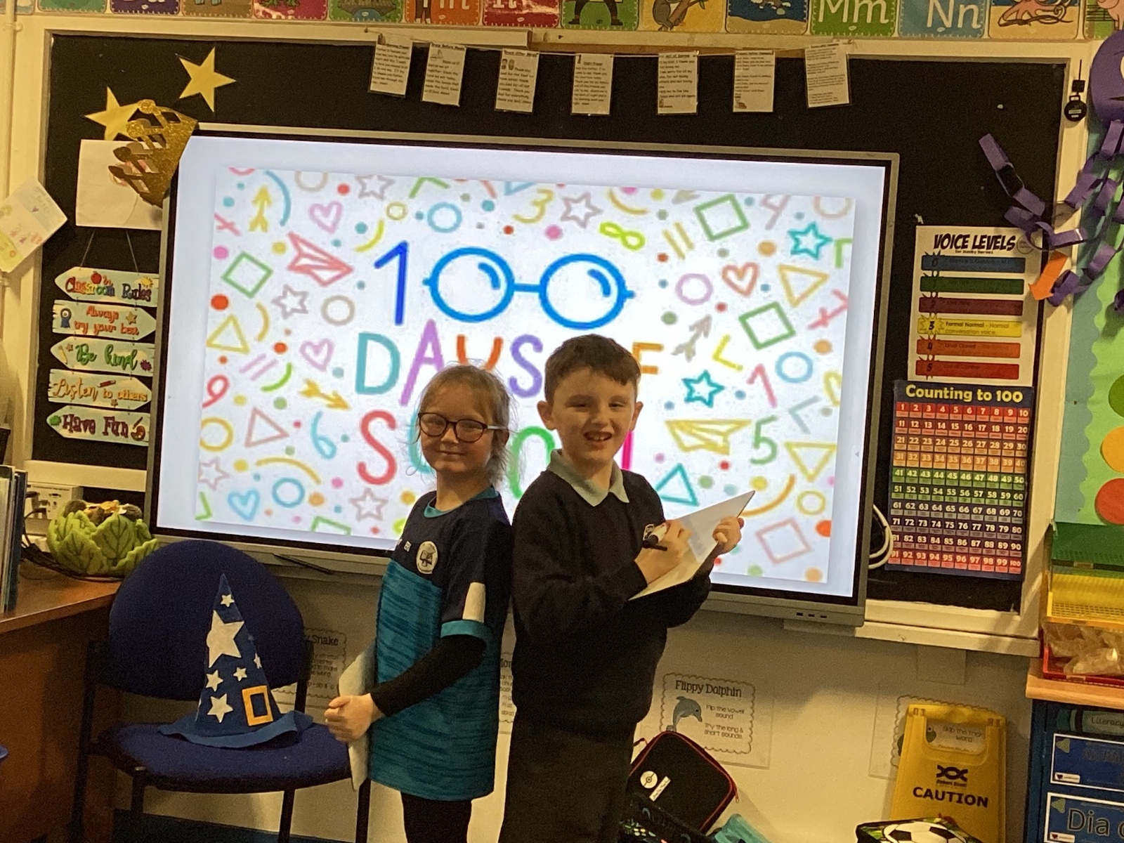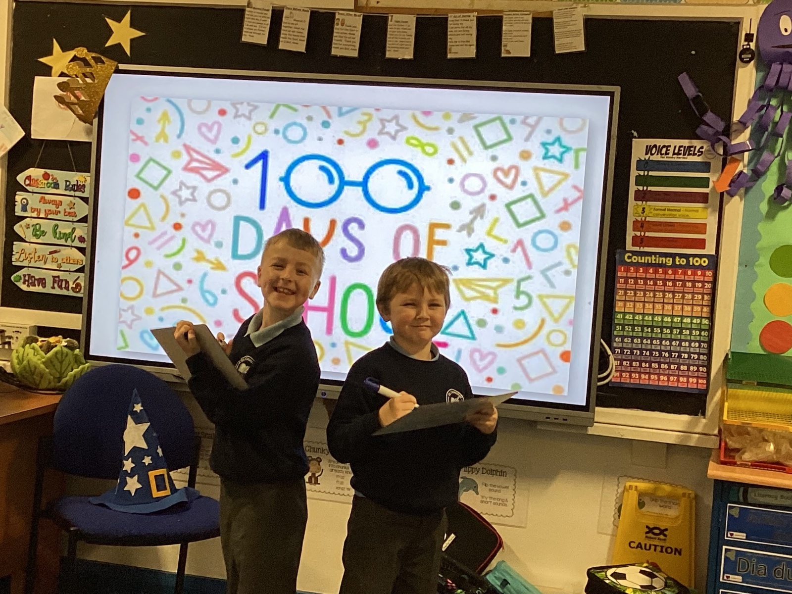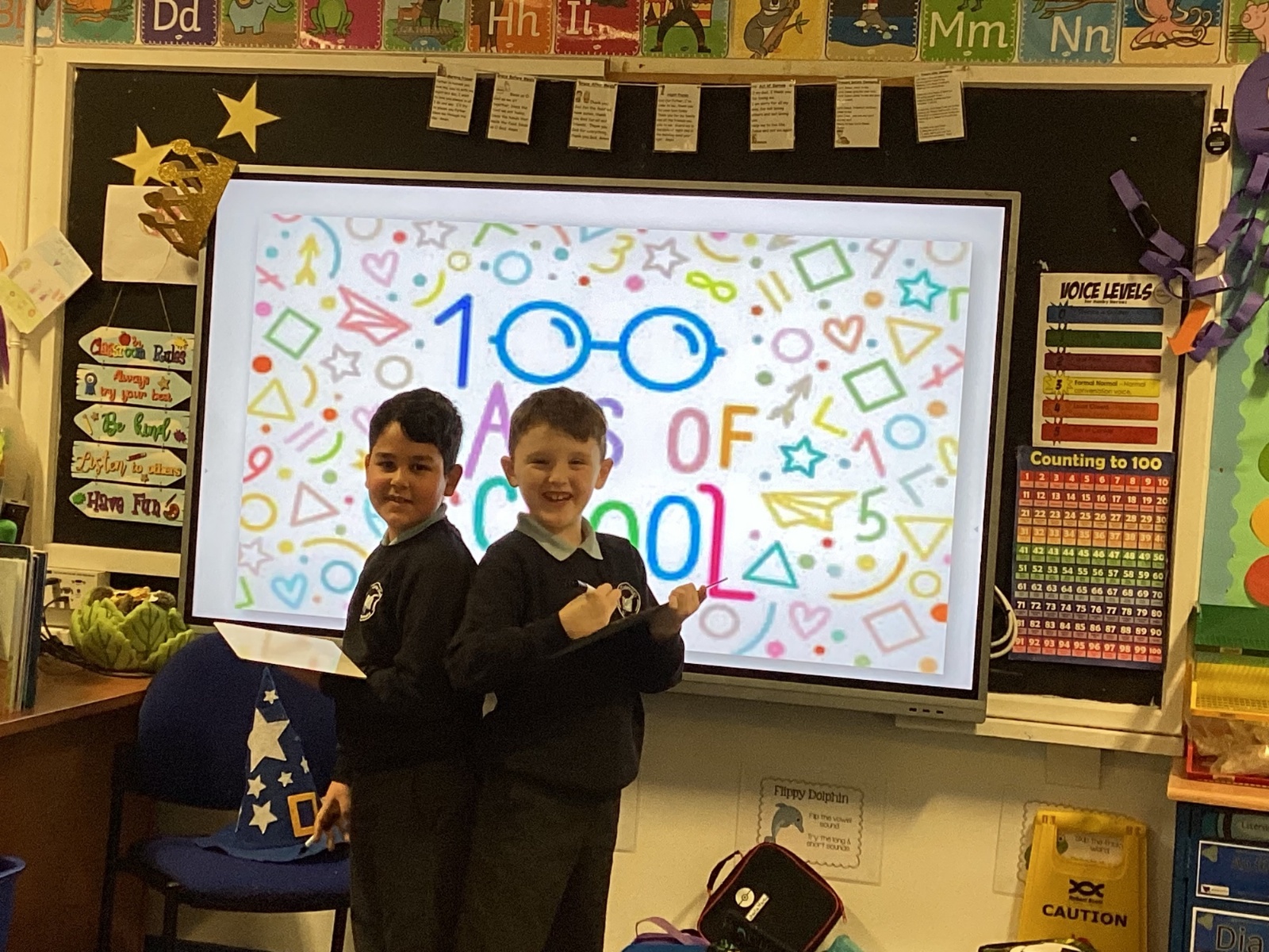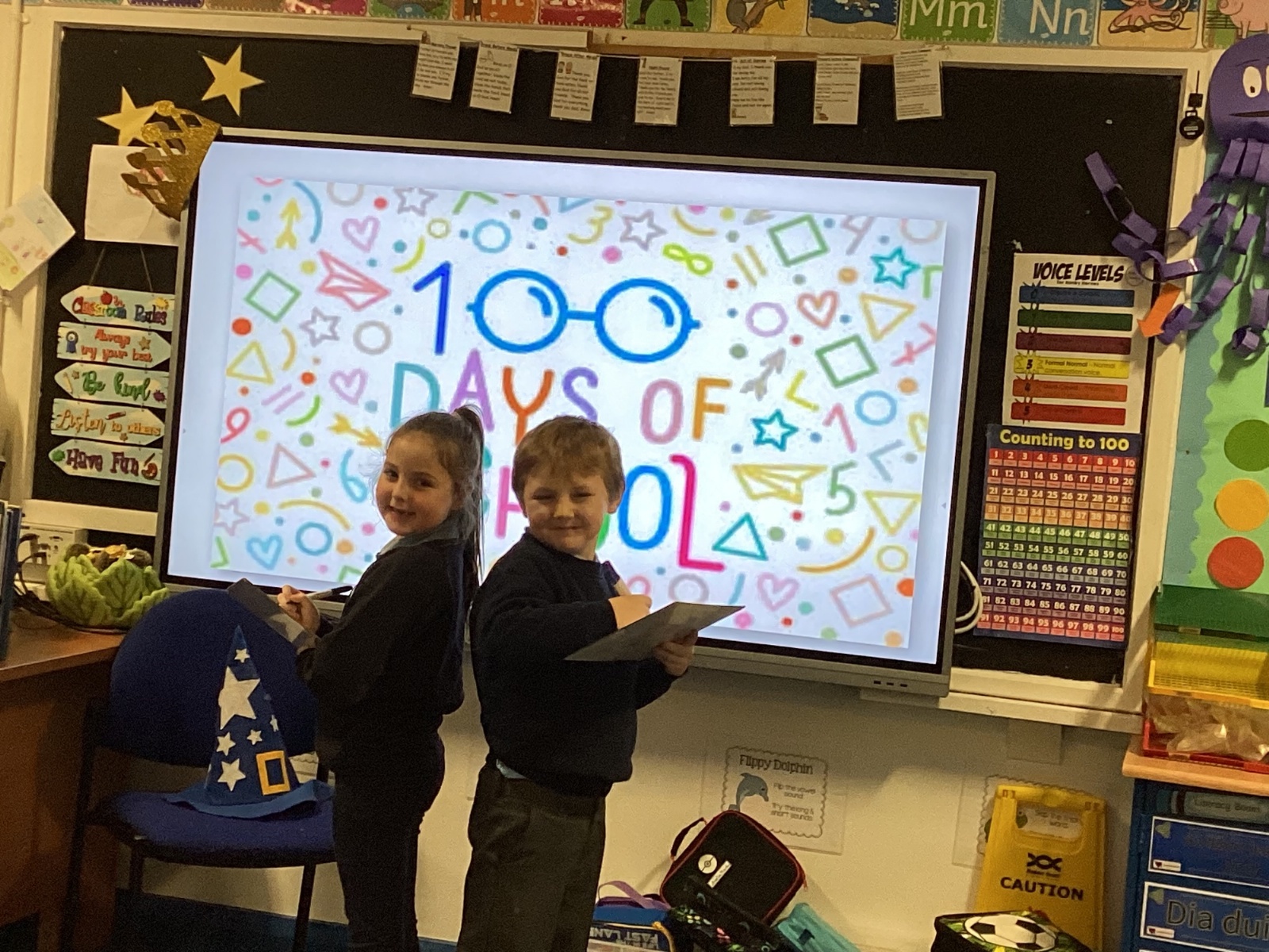 P4B took part in a range of fun activities to celebrate 100 days of school including estimating and counting 100 drops of water, creating self-portraits in 100 years time and taking part in a mental maths quiz!