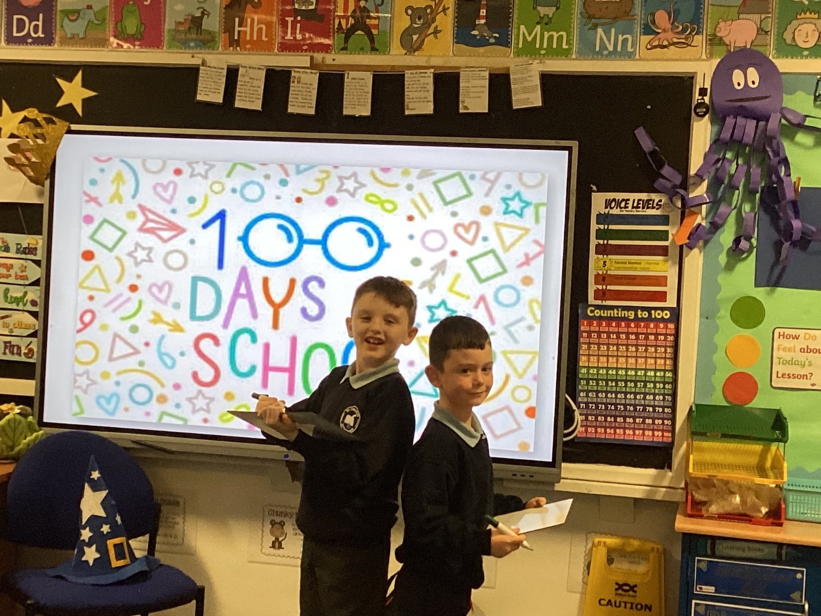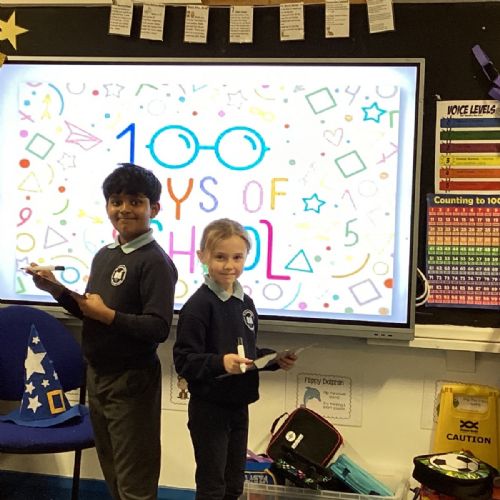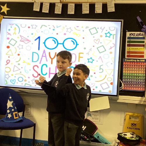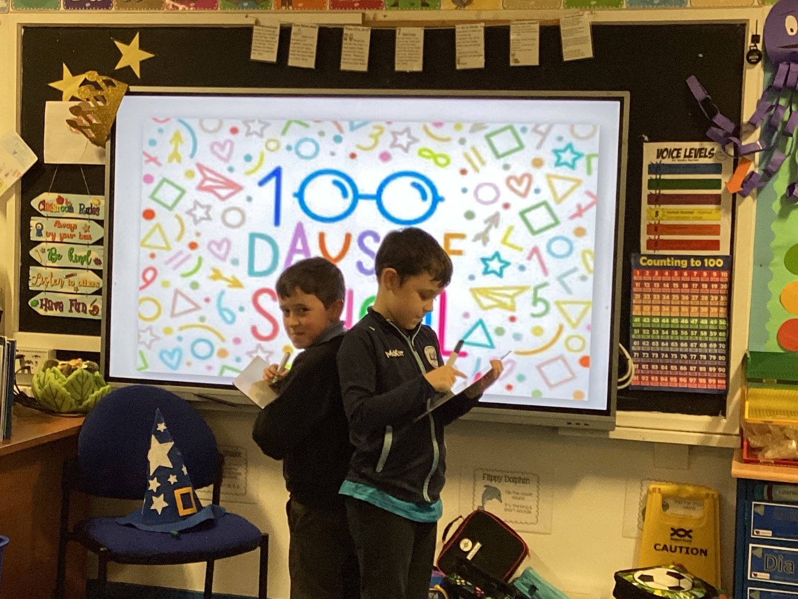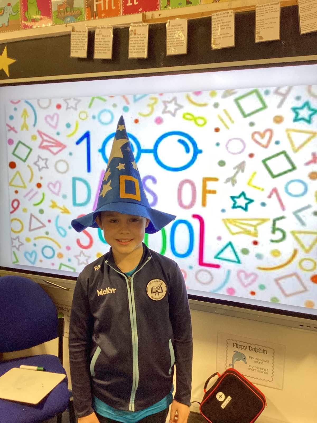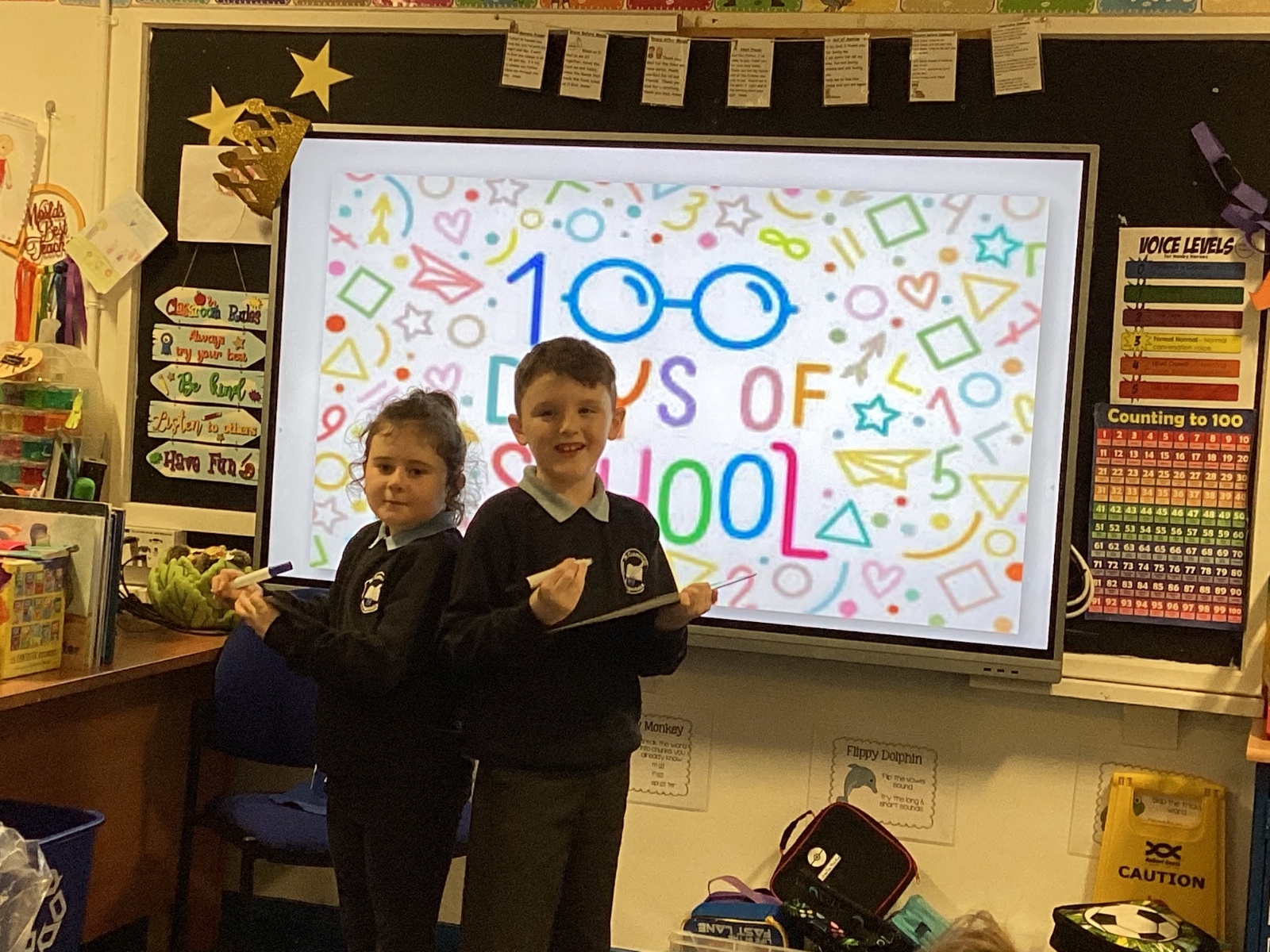 P4B took part in a range of fun activities to celebrate 100 days of school including estimating and counting 100 drops of water, creating self-portraits in 100 years time and taking part in a mental maths quiz!