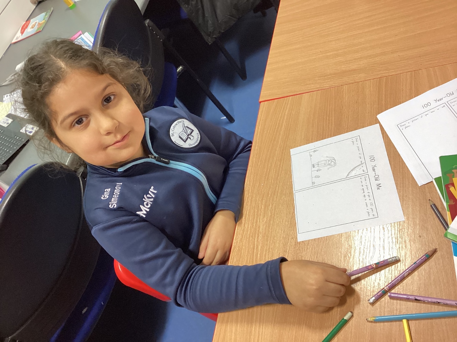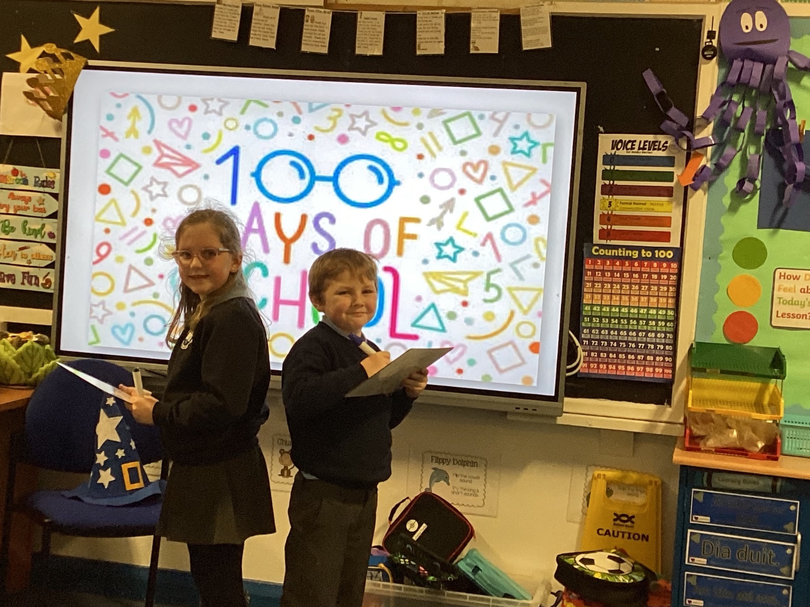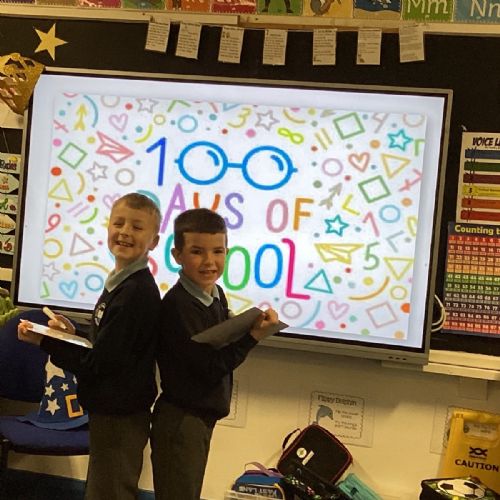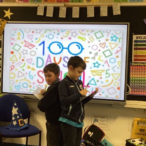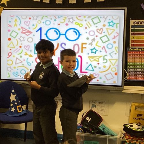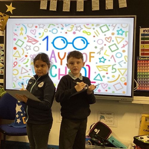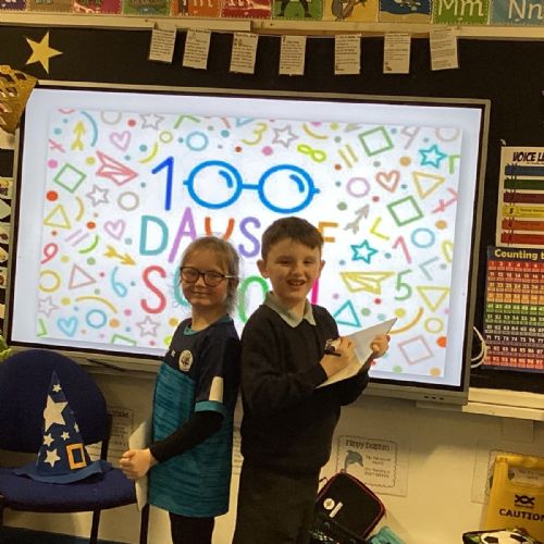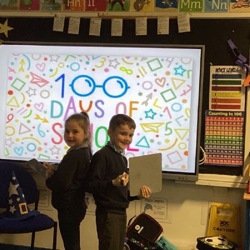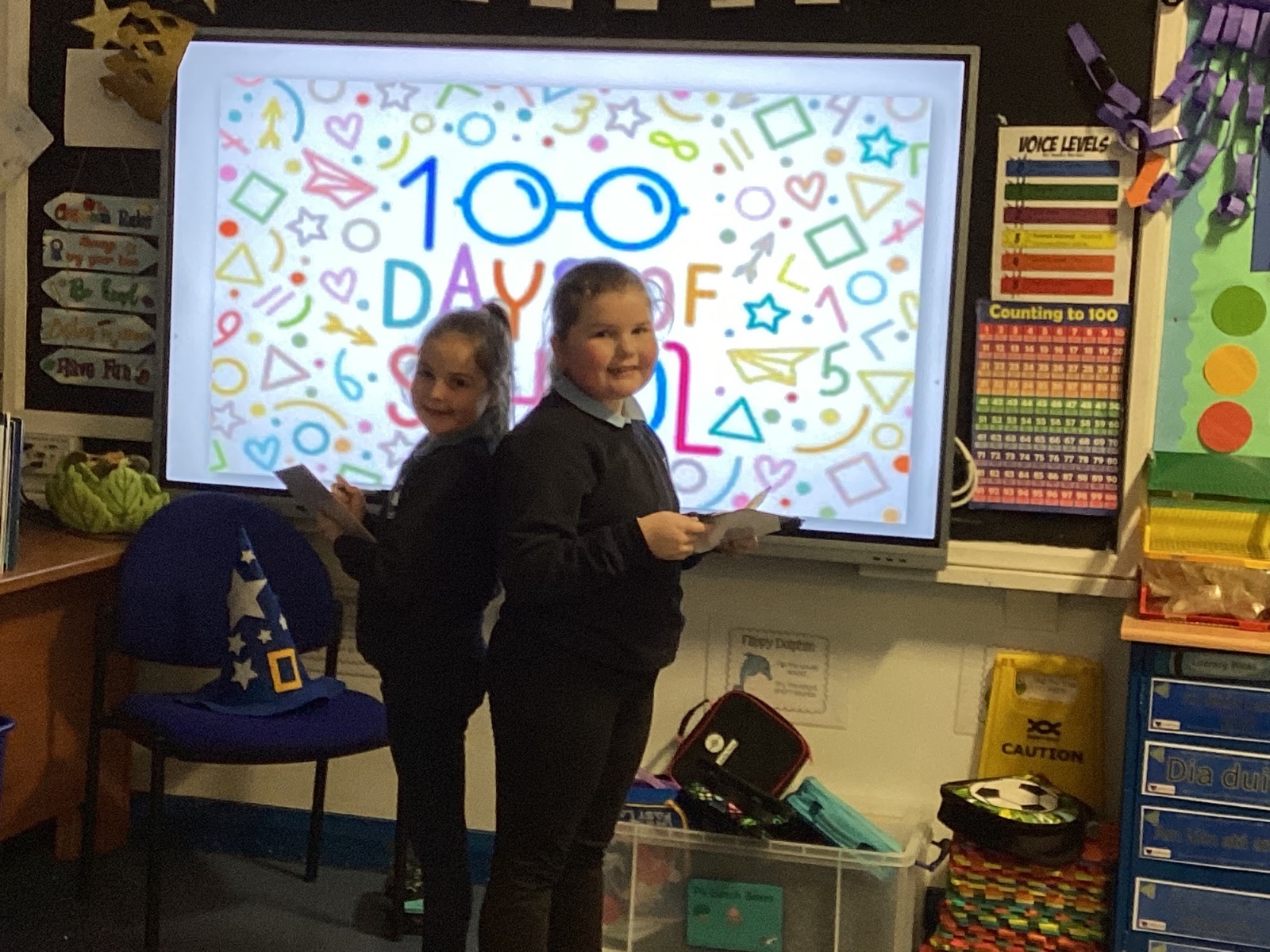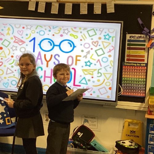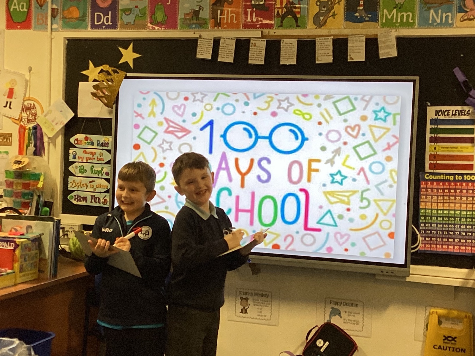 P4B took part in a range of fun activities to celebrate 100 days of school including estimating and counting 100 drops of water, creating self-portraits in 100 years time and taking part in a mental maths quiz!