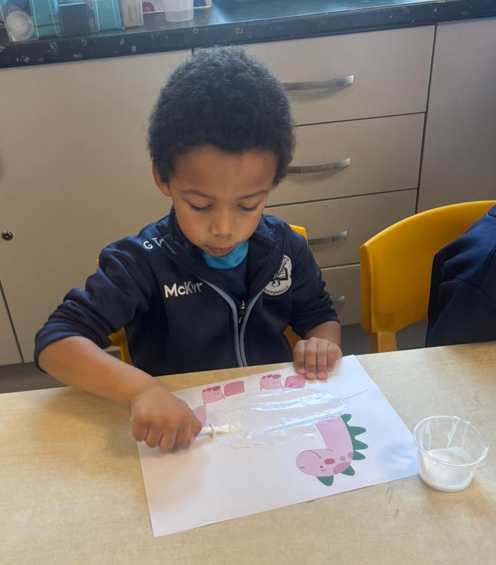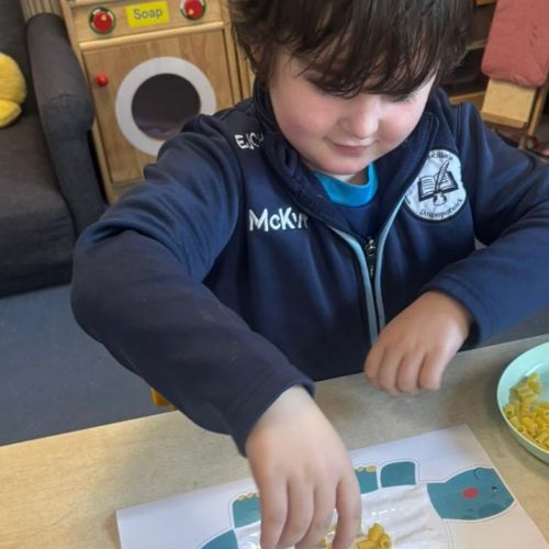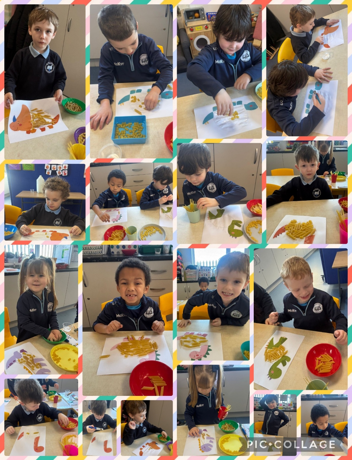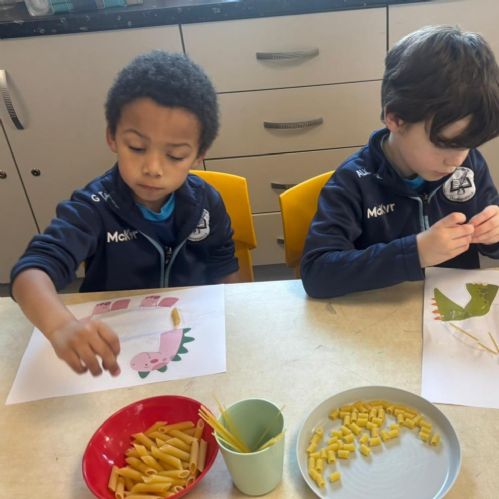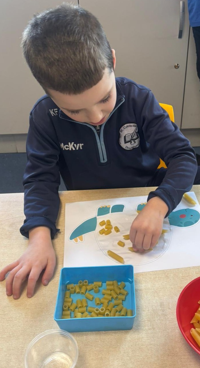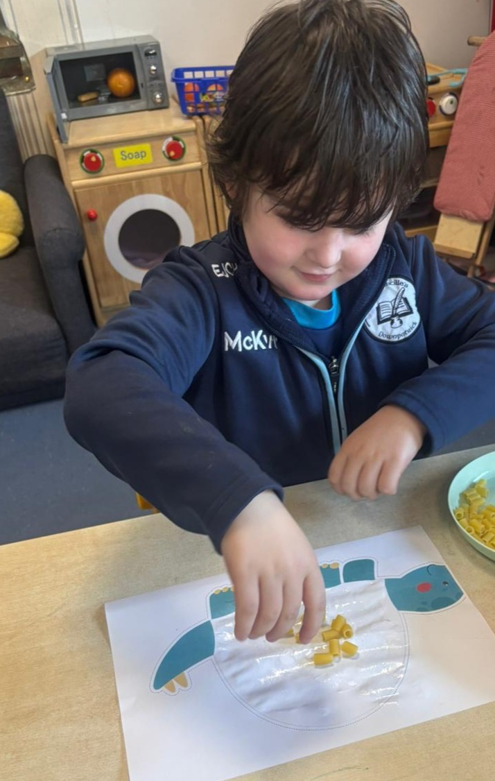 The children explored making dinosaur pasta pictures and salt dough dinosaur fossils.