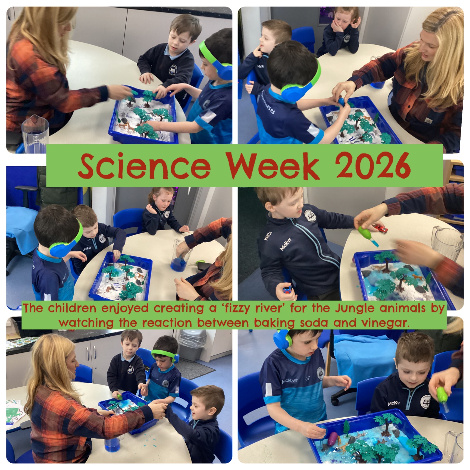 The children created a 'fizzy river' for their jungle habitat by creating a chemical reaction between vinegar and bicarbonate of soda.