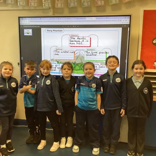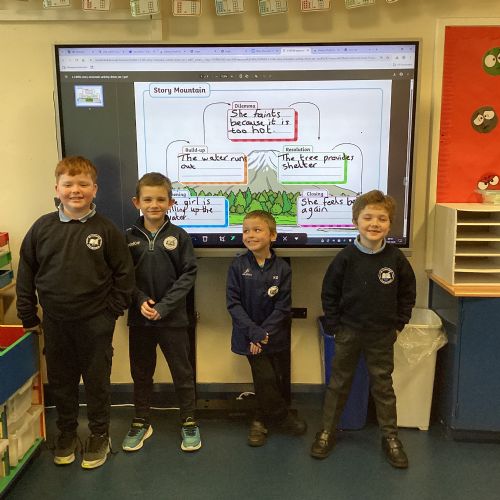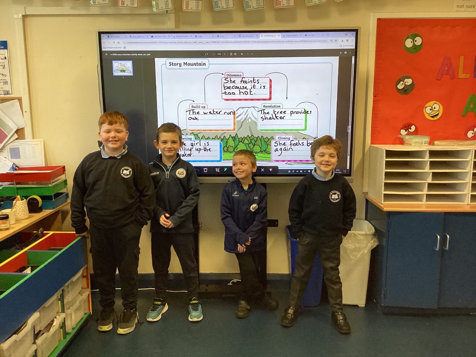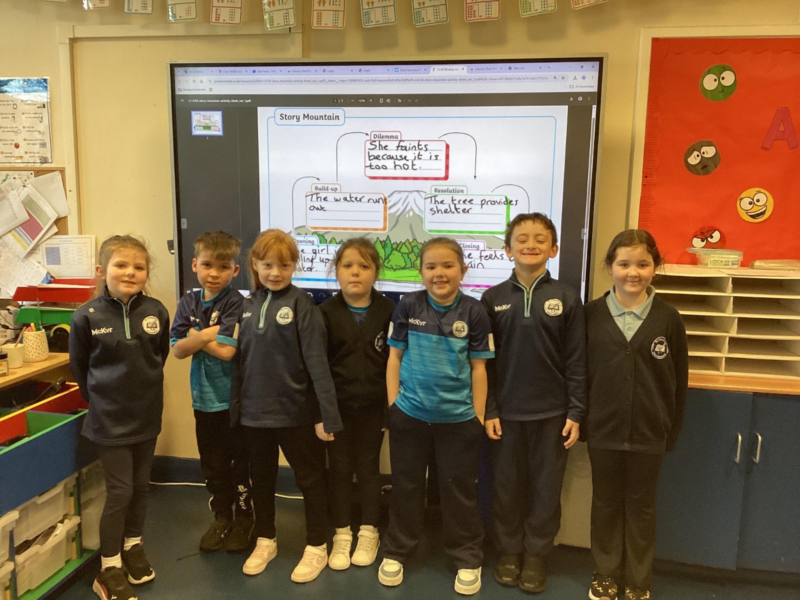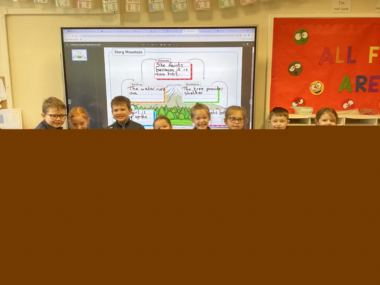 The children worked together collaboratively to complete a story mountain for the story Zahra. They discussed the key events, including the beginning, build-up, problem, resolution, and ending, and shared their ideas with one another. This activity helped the children develop their understanding of story structure while encouraging teamwork, communication, and creativity.